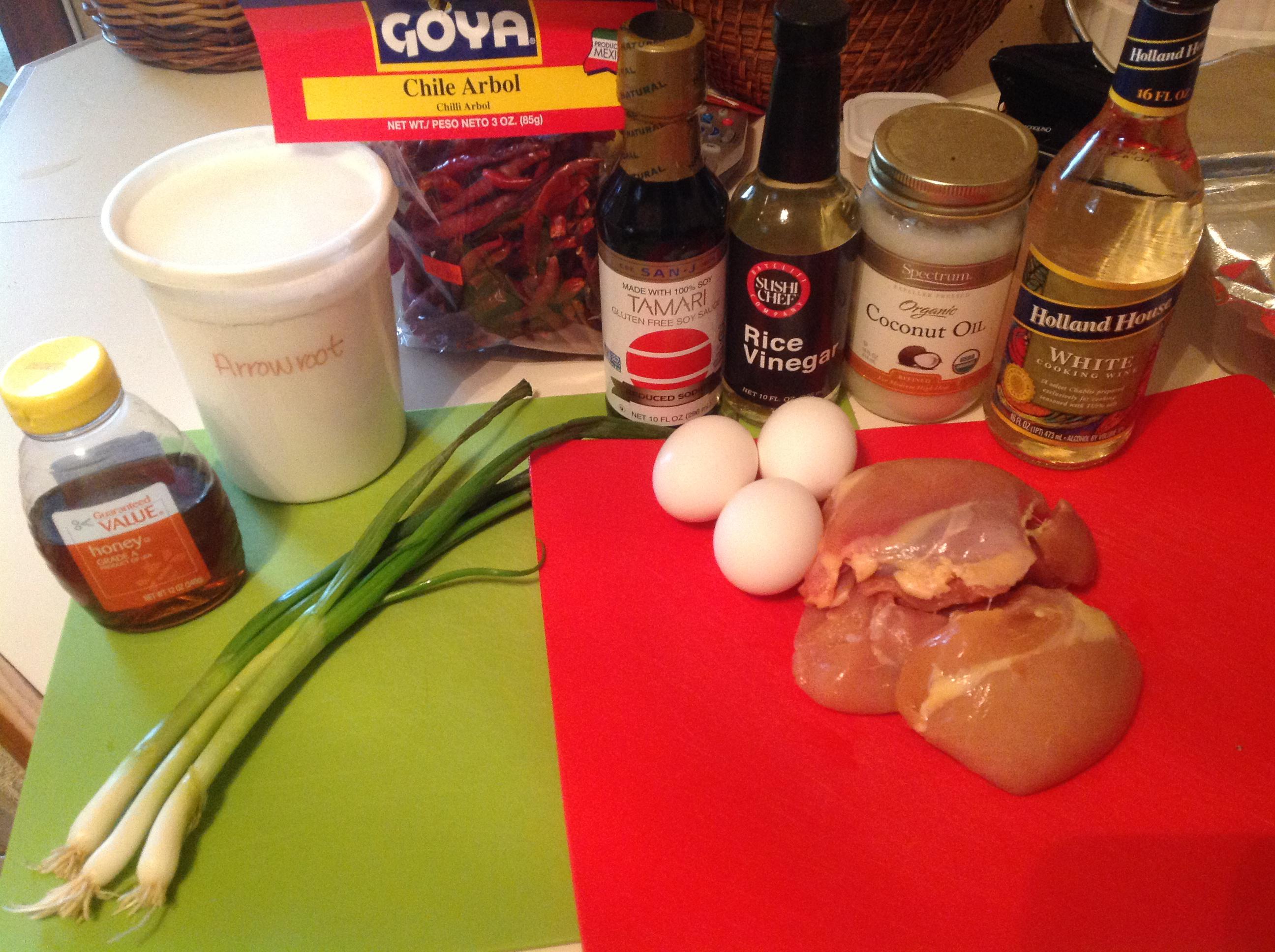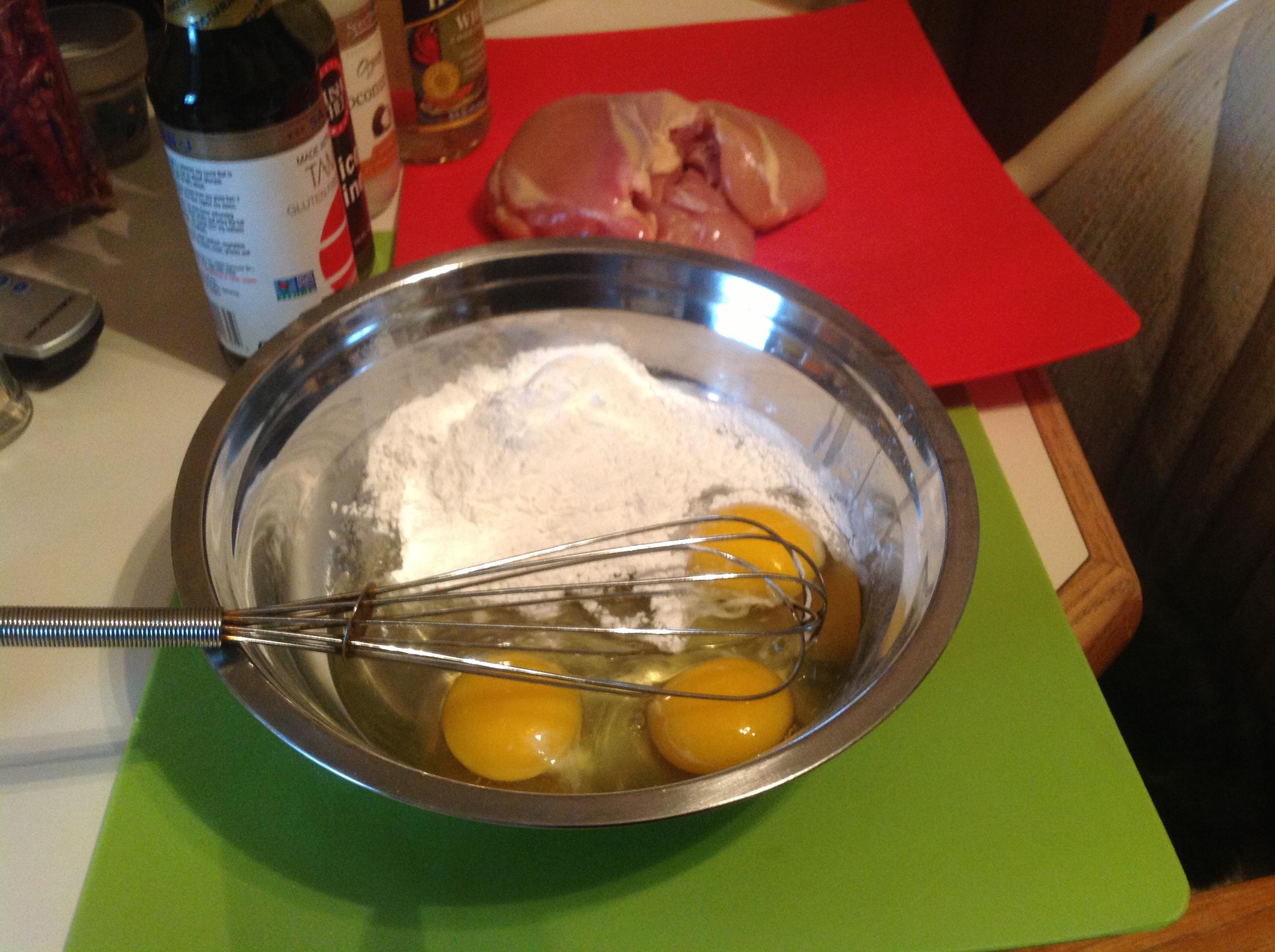 To make the batter for the chicken combine the eggs and arrowroot powder. Whisk together vigorously until it becomes a thick batter. The arrowroot powder replaces the traditional use of cornstarch.