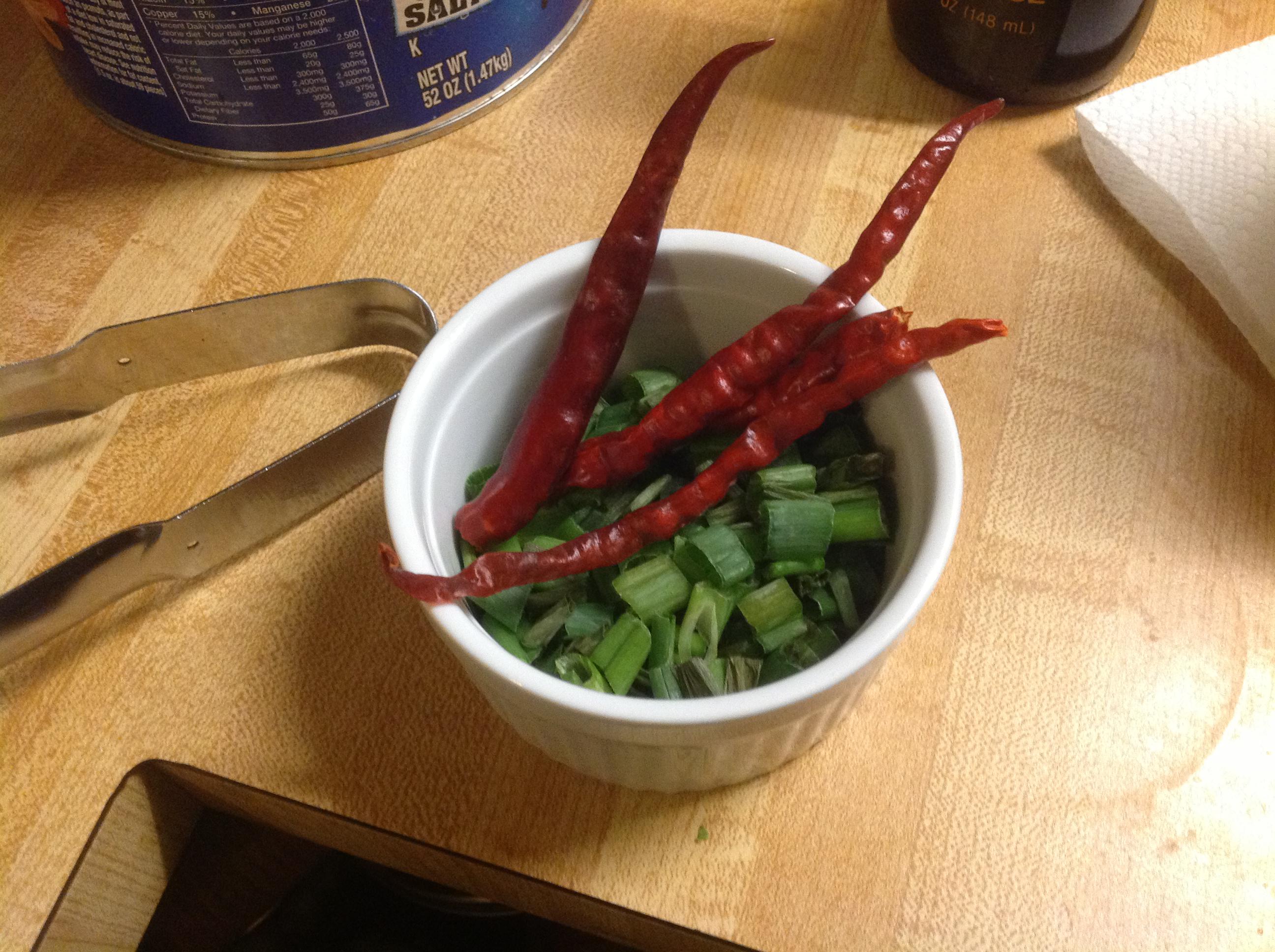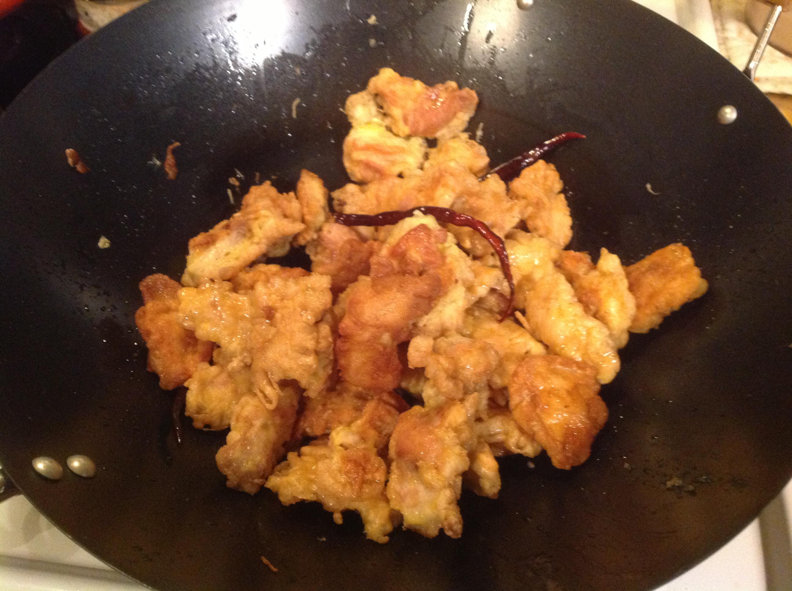 Once the chicken is all done frying, it’s wok time. Put 1-2 tablespoons of coconut oil into the wok and warm it on medium-high heat. Put in the dried red chilies – and this is where the magic happens. The oil gets all spicy and lovely. Only stir fry them for about 30 seconds or the magic will not happen and all you will have are burned chilies.