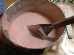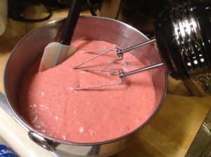 - Using an electric mixer on medium speed, beat in pureed strawberries to other ingredients until smooth.