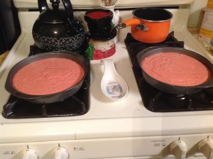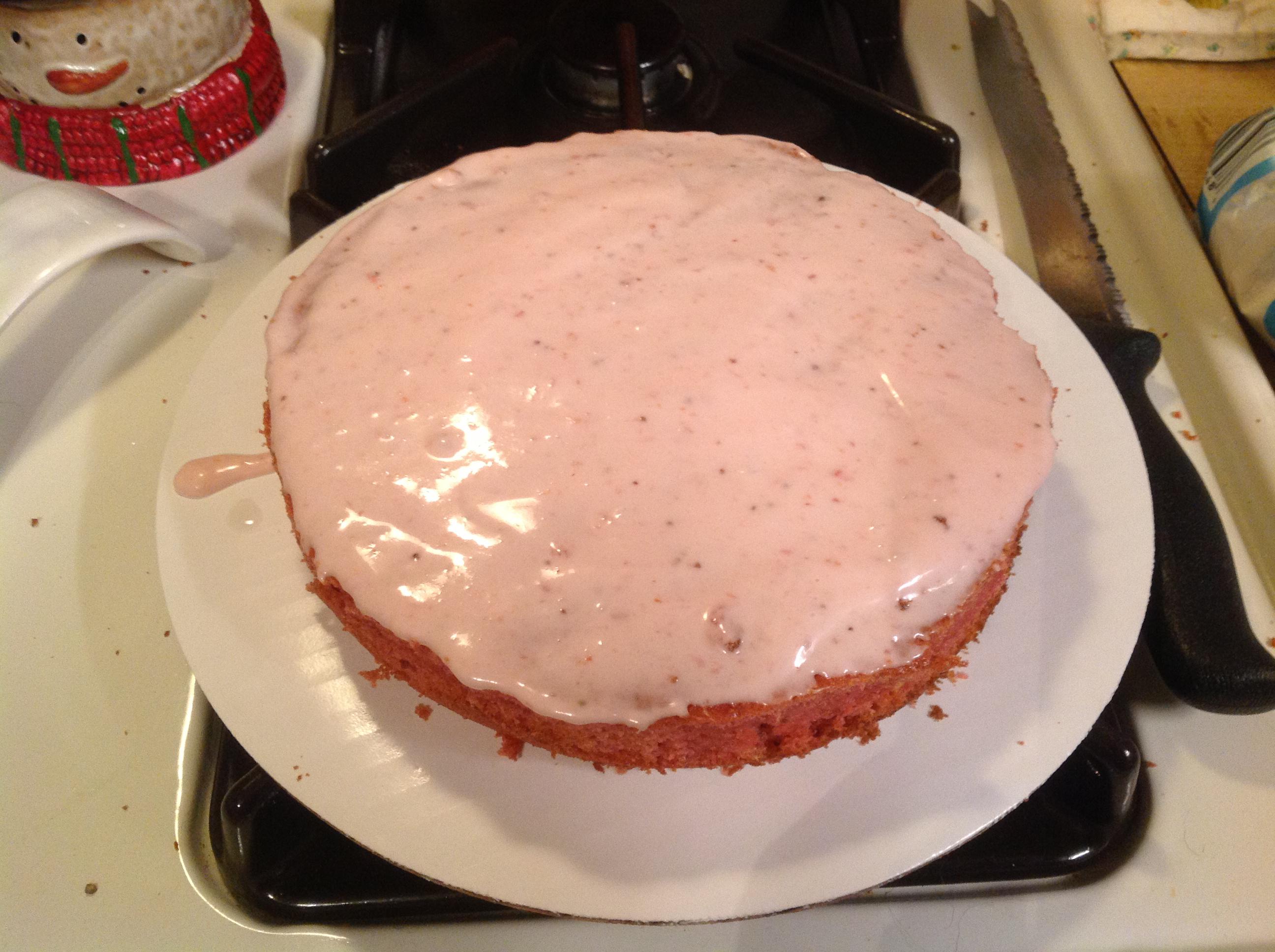 Once the cakes are completely cooled, trim any uneven edges and place the first layer on a cardboard cake round, cake stand, plate, or whatever you want to use. I used a cardboard cake round because it made a makeshift cake turner. I was never really into the buy-specialty-kitchen-products-you’ll-only-use-once-ever thing, but I have to say that it’s a lot easier to ice the cake when you have the ability to turn it easily. Spread some of the frosting on top of the first later, add the second trimmed layer, and slather the cake with the perfectly pink icing.
