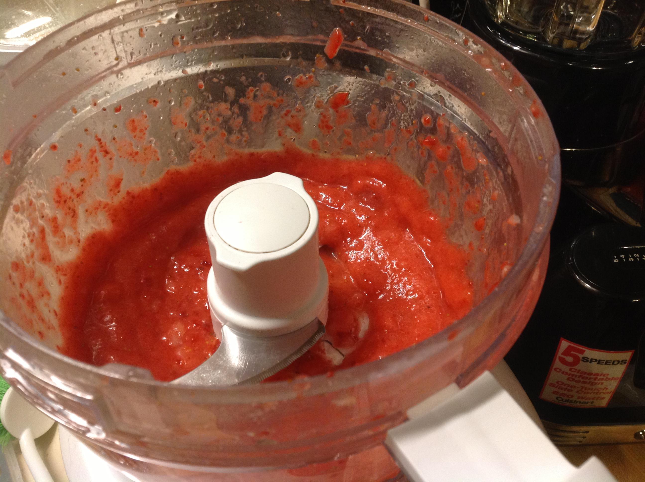 - Puree 2 cups of thawed strawberries in a blender or food processor.