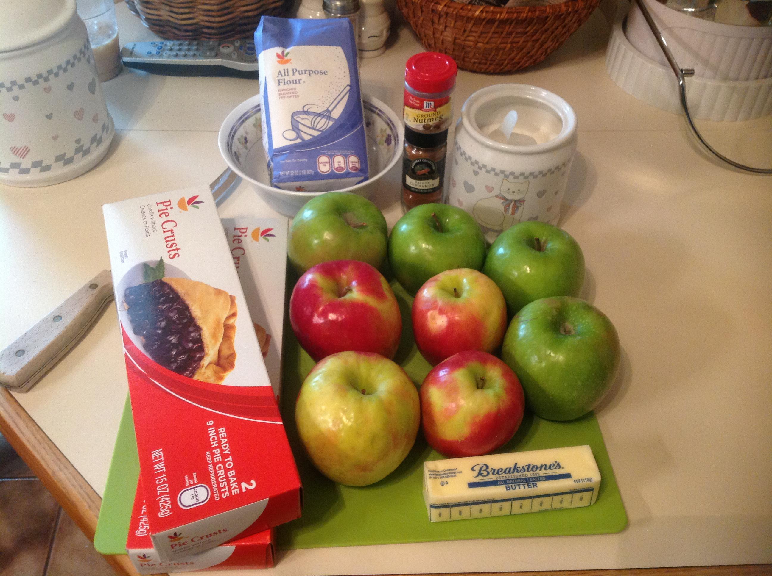 Gather all necessary ingredients: Flour, sugar, cinnamon, nutmeg, butter, pie crusts, and apples. I know that some of you out there may be brand-snobs, but I don’t discriminate. I think the Stop & Shop brand pie crusts work just as well as the more expensive ones. One note: make sure you get chilled pie crusts and not frozen.