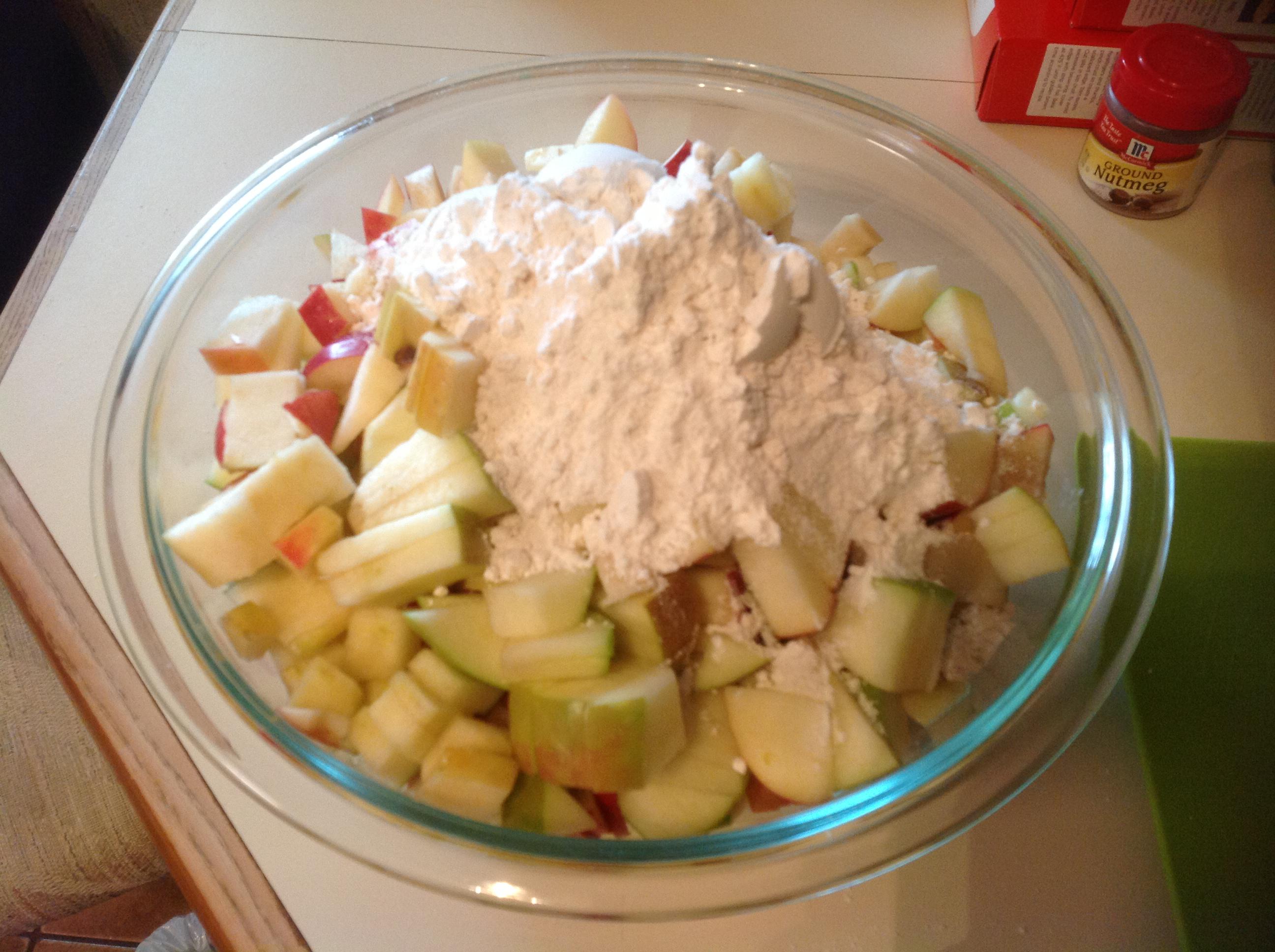Combine the apples with the flour, sugar, cinnamon, and nutmeg. Make sure to mix it really well or else you’ll have nasty clumps of flour and sugar at the bottom. I like to let the apples hang out in this mixture for a while because they seem to soak in the flavors nicely. So while those are sitting, start unrolling your pastry crust.