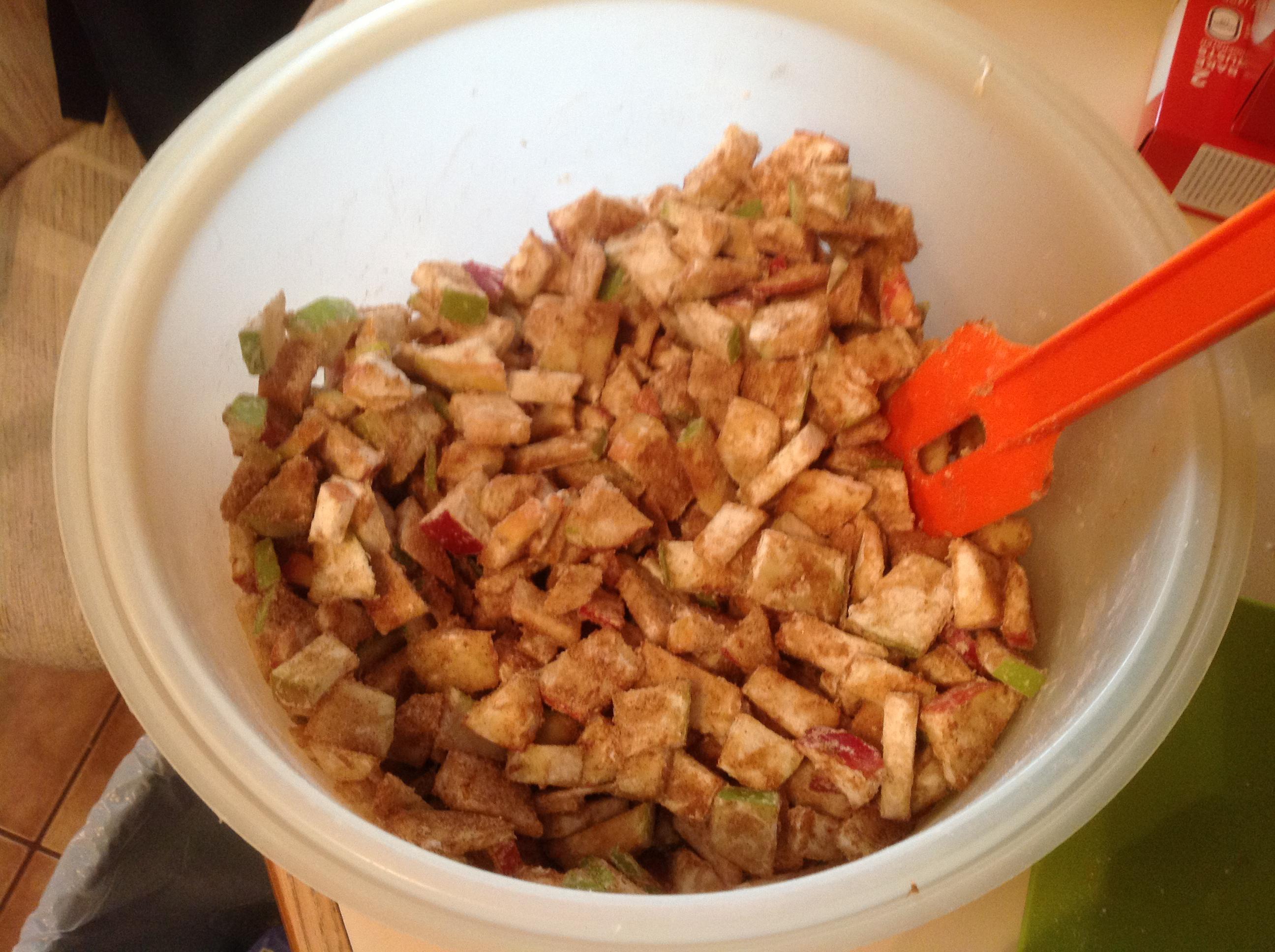 Chop up the apples into small cubes or rectangles. You can use red apples, green apples, or a mixture of both. I used both because I love the combination of sweet and tart. I started out with this pretty Pyrex glass bowl, but soon switched to the not-so-attractive giant plastic tub because, well, it’s GIANT.