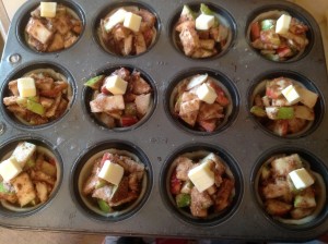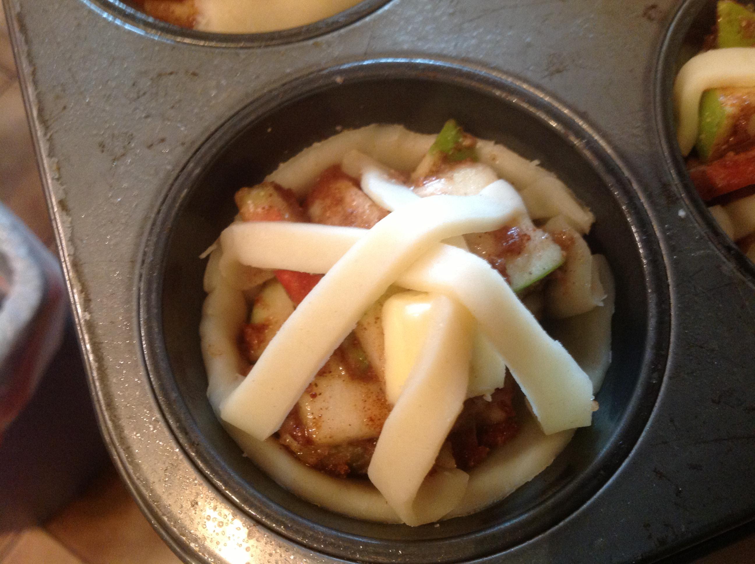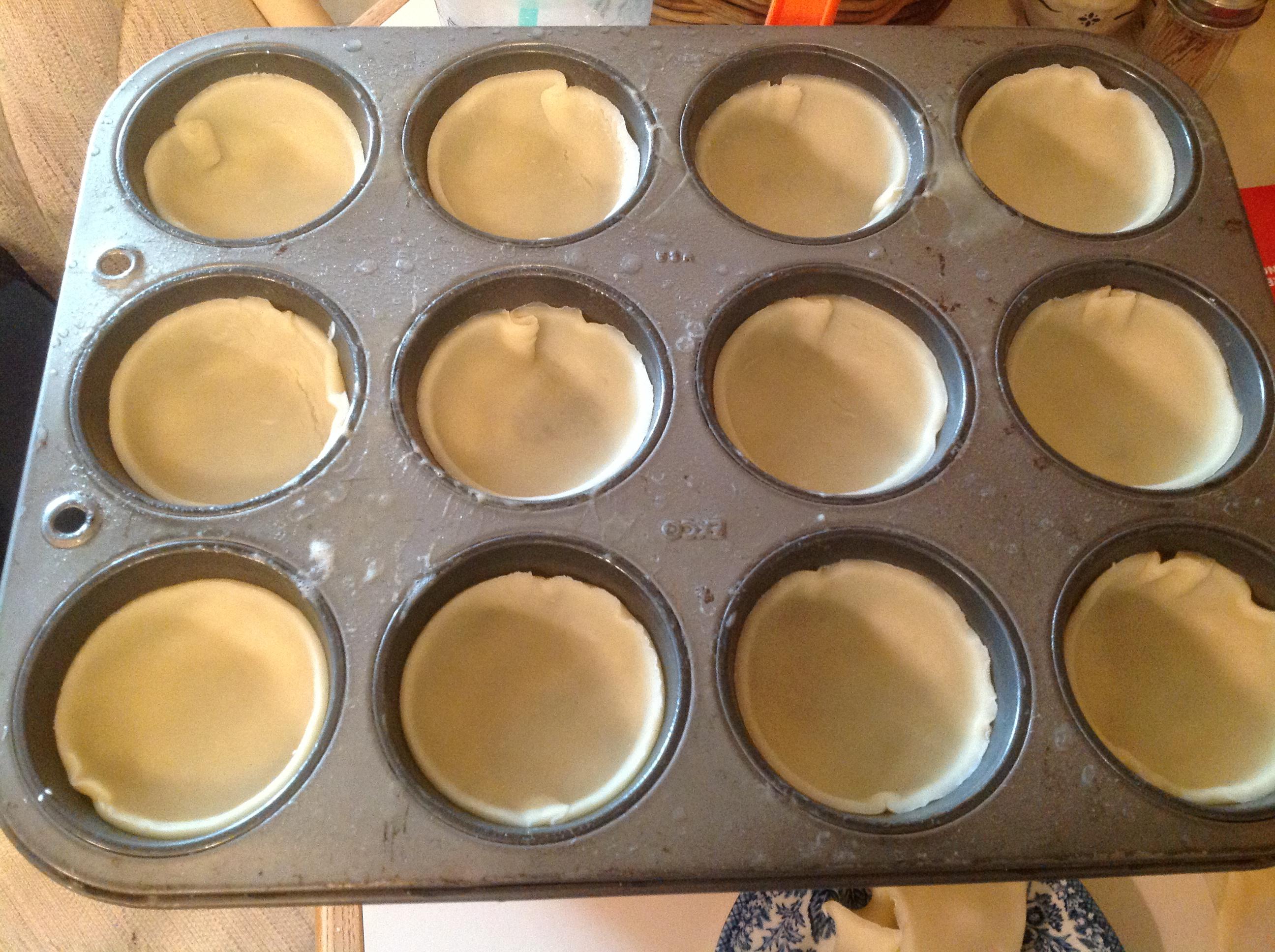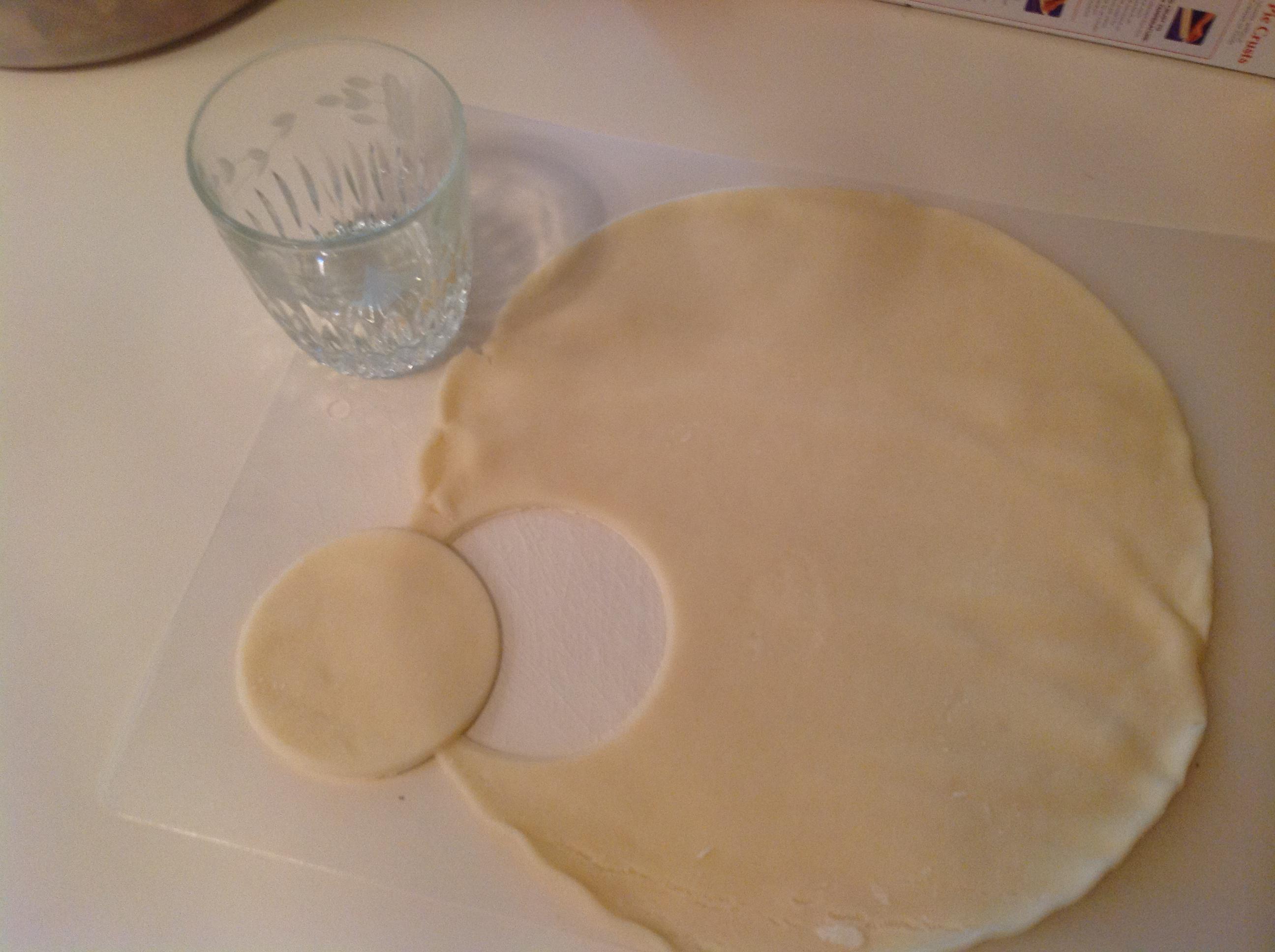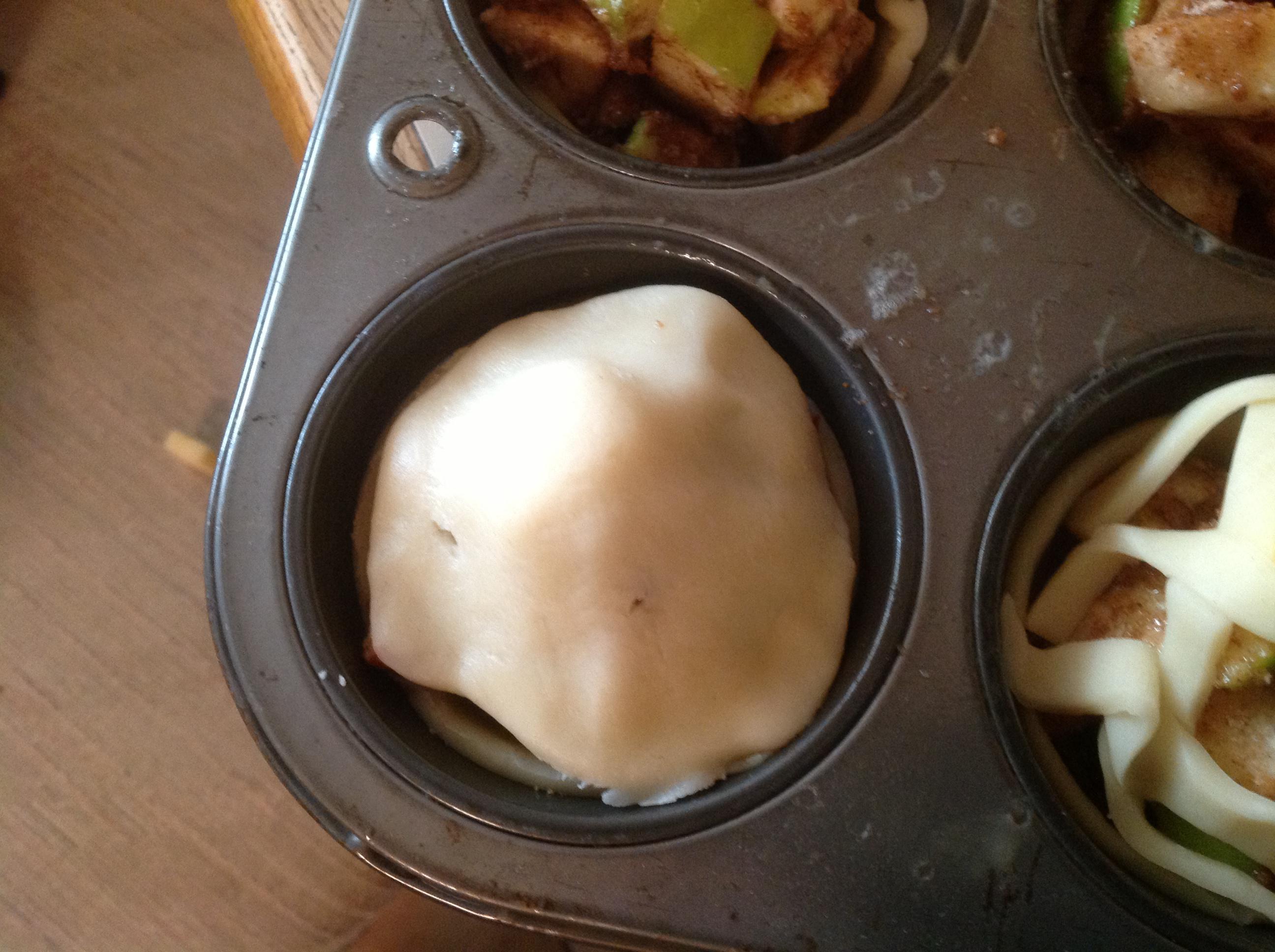 The nice thing about these pre-made crusts is that they are PRE-MADE(!!) and they roll out nicely. Who wants to spend all day making homemade pie crust that might end up dry and floury anyway? Exactly. I used my mom’s gorgeous rock glasses to cut out the bottom pie crusts for the cupcake pan. Since I am the illest-prepared baker ever, I only have one cupcake pan so I made 12 mini pies at a time.