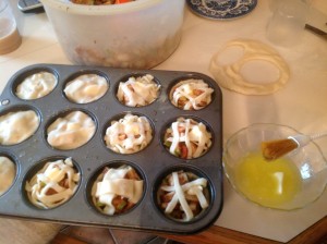 Unfortunately, I only got 9 crusts out of the first pie crust, so I had to go into the second package to make more. I always grease my baking pans because I am paranoid everything will stick, so I hit it with a little baking spray – for those of you unfamiliar with this product, it’s basically a mix of cooking lube with flour.