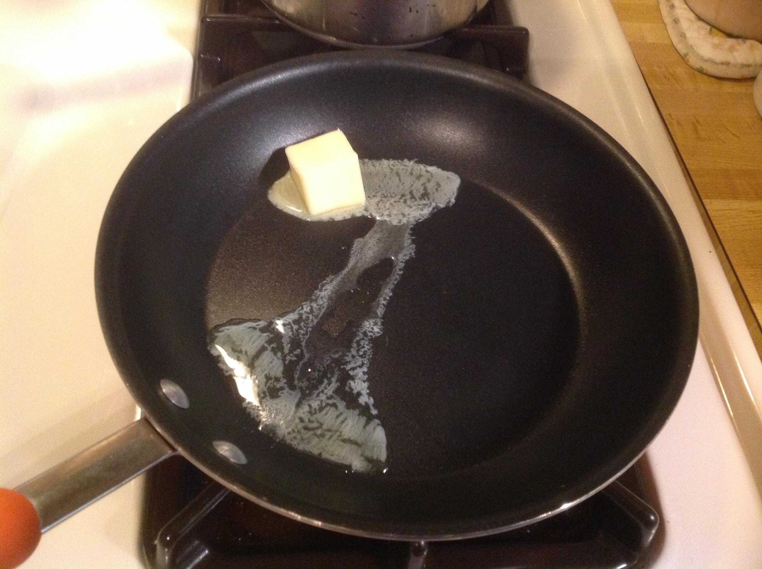 A few months ago I made a peach cobbler, so I figured I could try something similar with my extra apples! I was really living on the wild side because I had no recipe, I just winged it! First, add a good amount of butter to a frying pan.