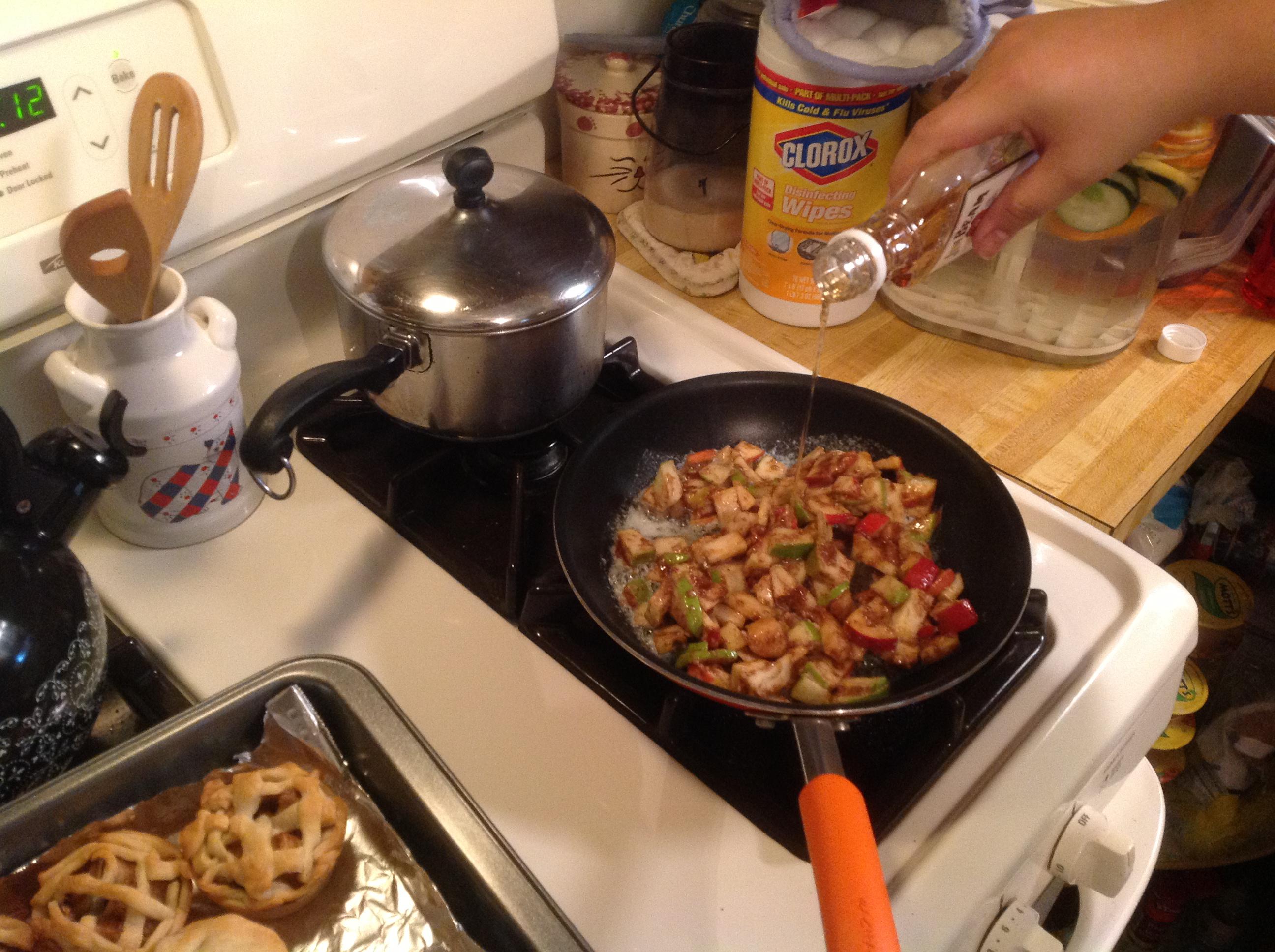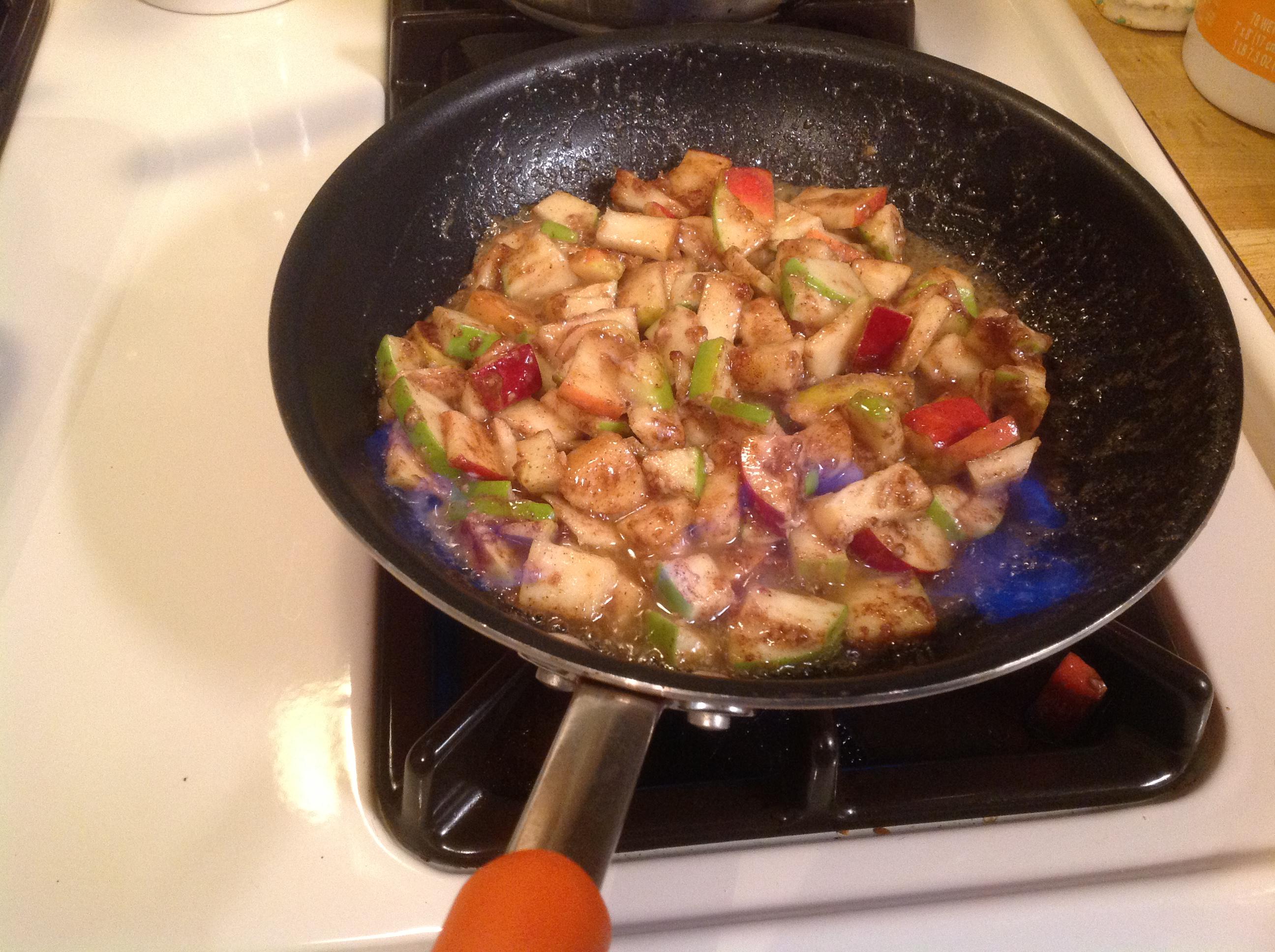 Saute the apples around for a while until they become soft and an oozy sauce starts to form. I added a little too much bourbon, so I raised the burner flame, tipped the pan, and let the fire burn off the remainder of the alcohol.