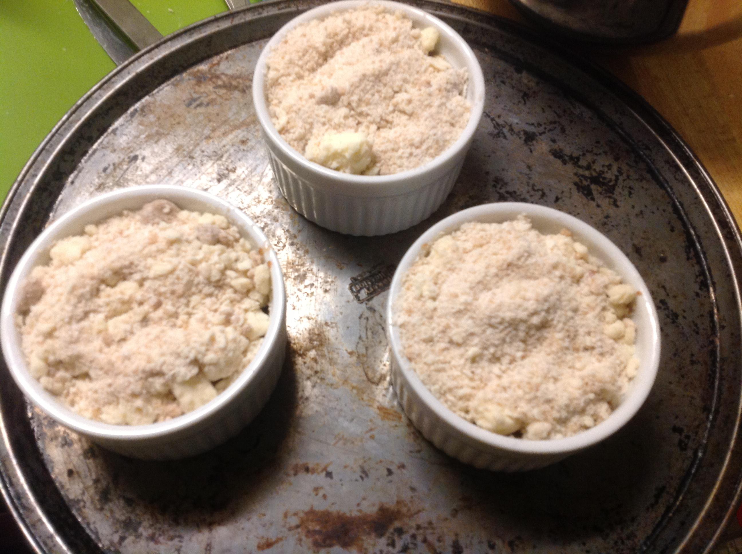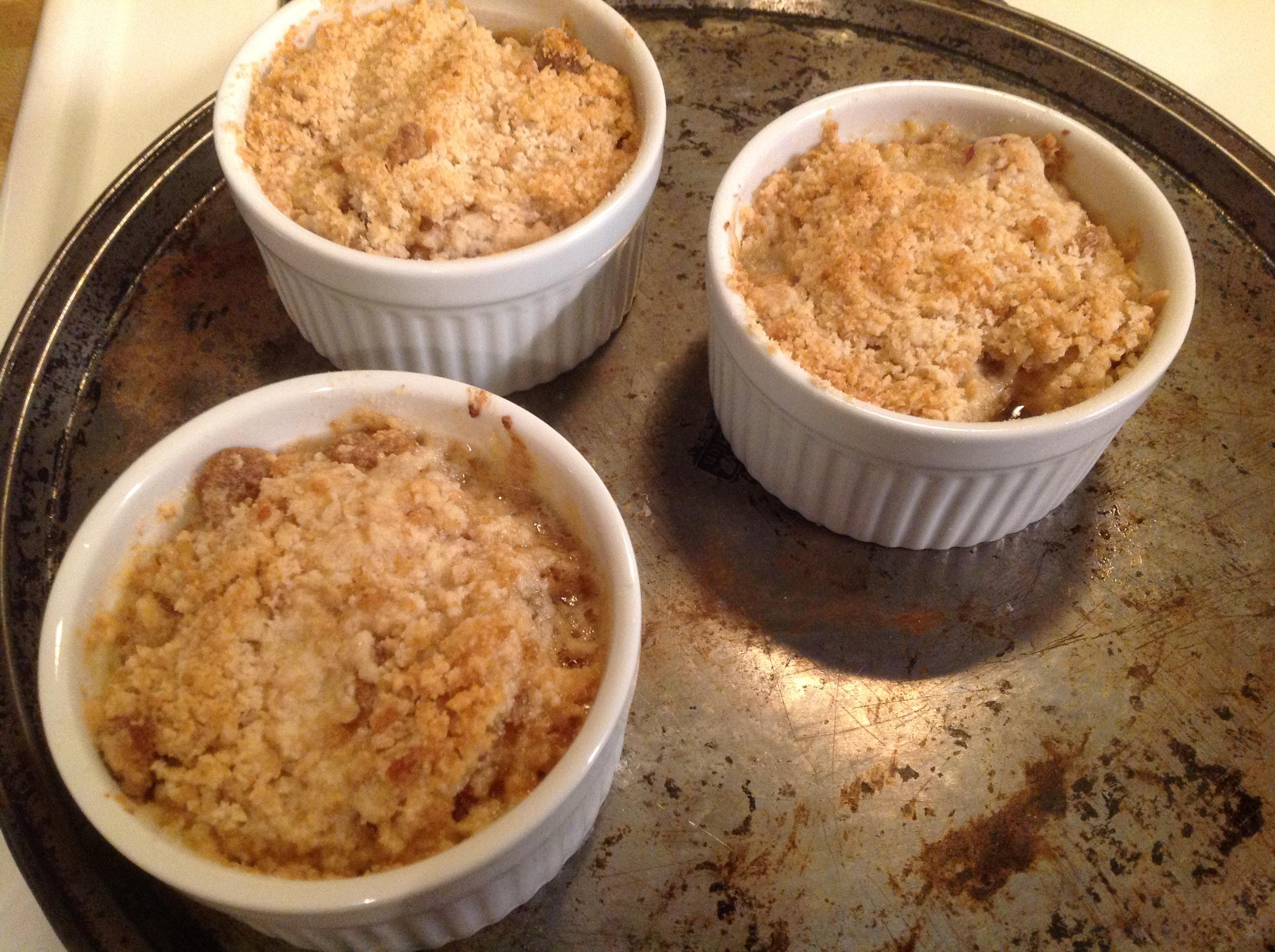 I made a quick crumble topping by mixing cold butter, brown sugar, flour, and vanilla extract together. Fill small ramekins with the sauteed apples and top with the crumble.