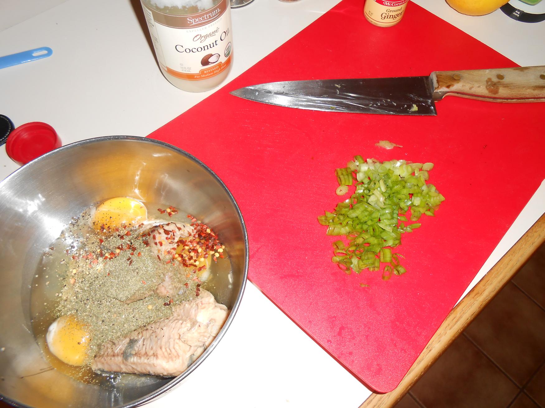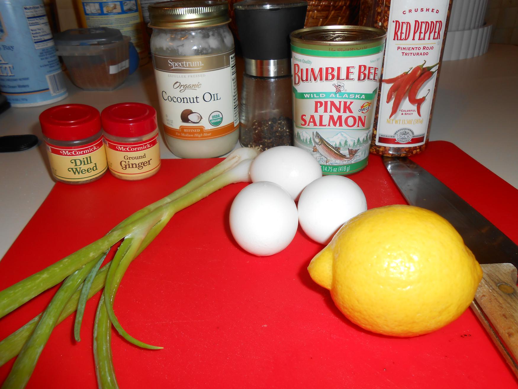 First, gather all of your ingredients: canned salmon, eggs, green onions, dill, ginger, red pepper flakes, s&p, coconut oil, and lemons.