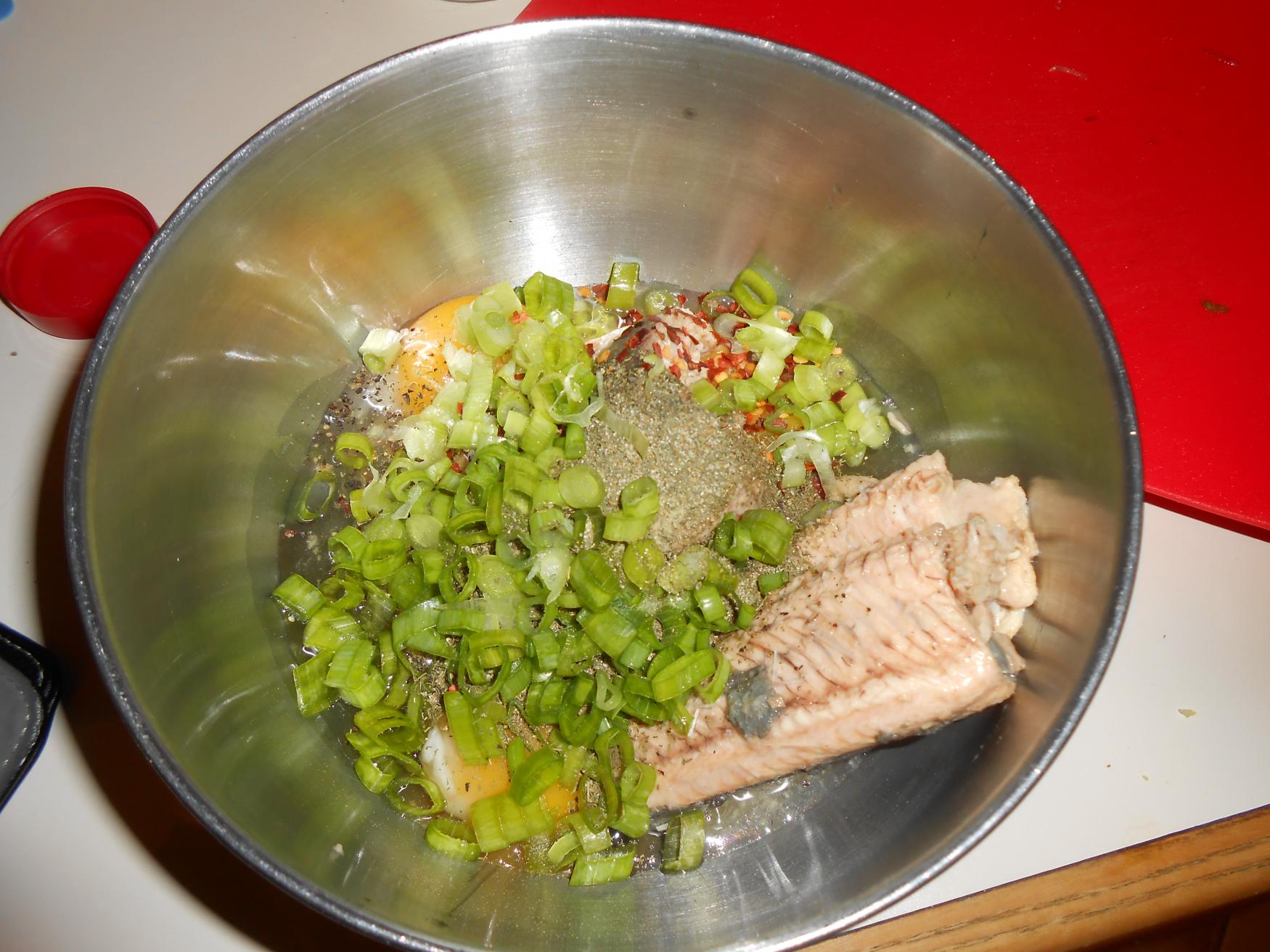 - Drain the water from the canned salmon and put in a large mixing bowl