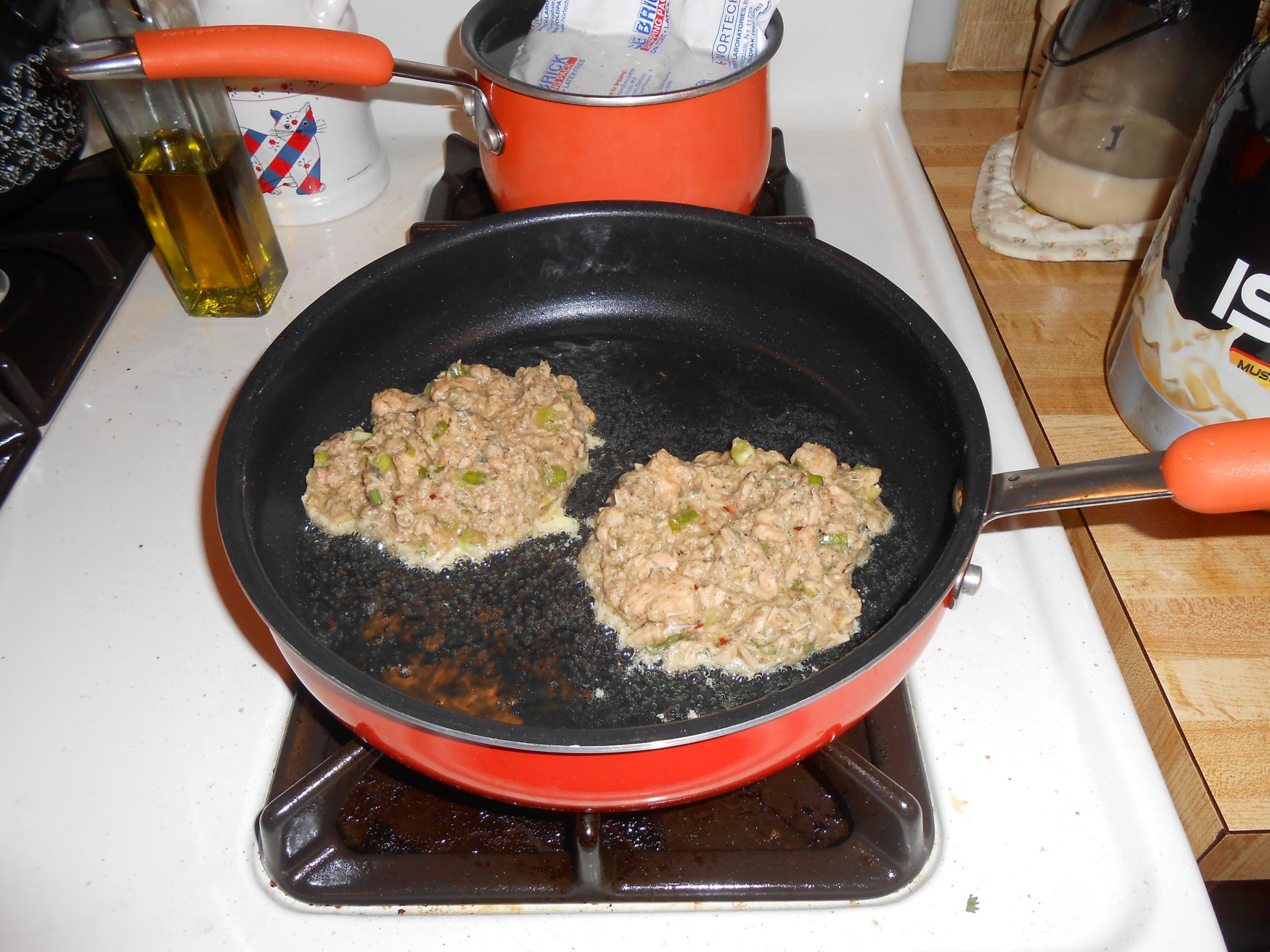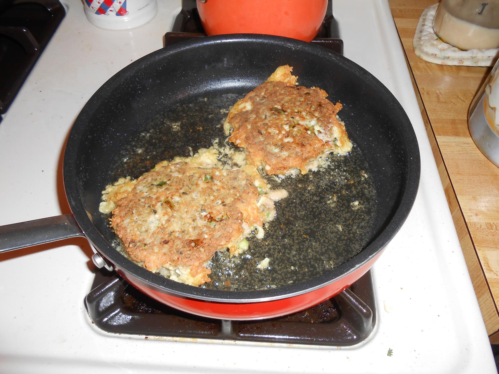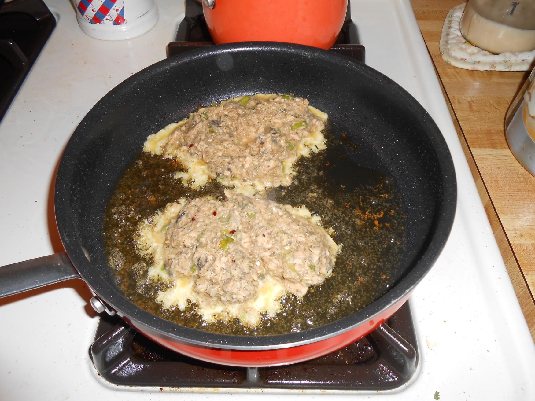 Melt the coconut oil in a medium frying pan. Add two large spoonfuls of the salmon mix until they are about the size of a pancake. Now LEAVE THEM ALONE! Do not poke or prod them or they will fall apart.