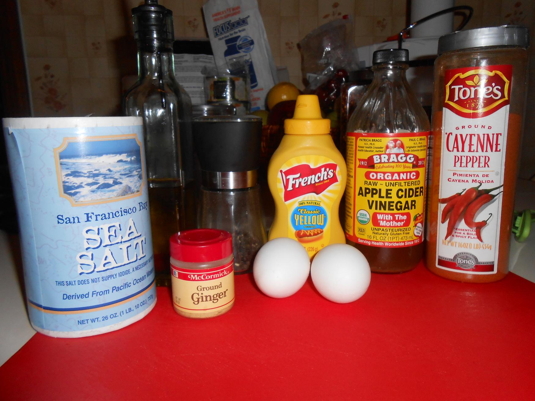Gather all of your ingredients: eggs, apple cider vinegar, yellow mustard, s&p, cayenne pepper, ground ginger, and olive oil.