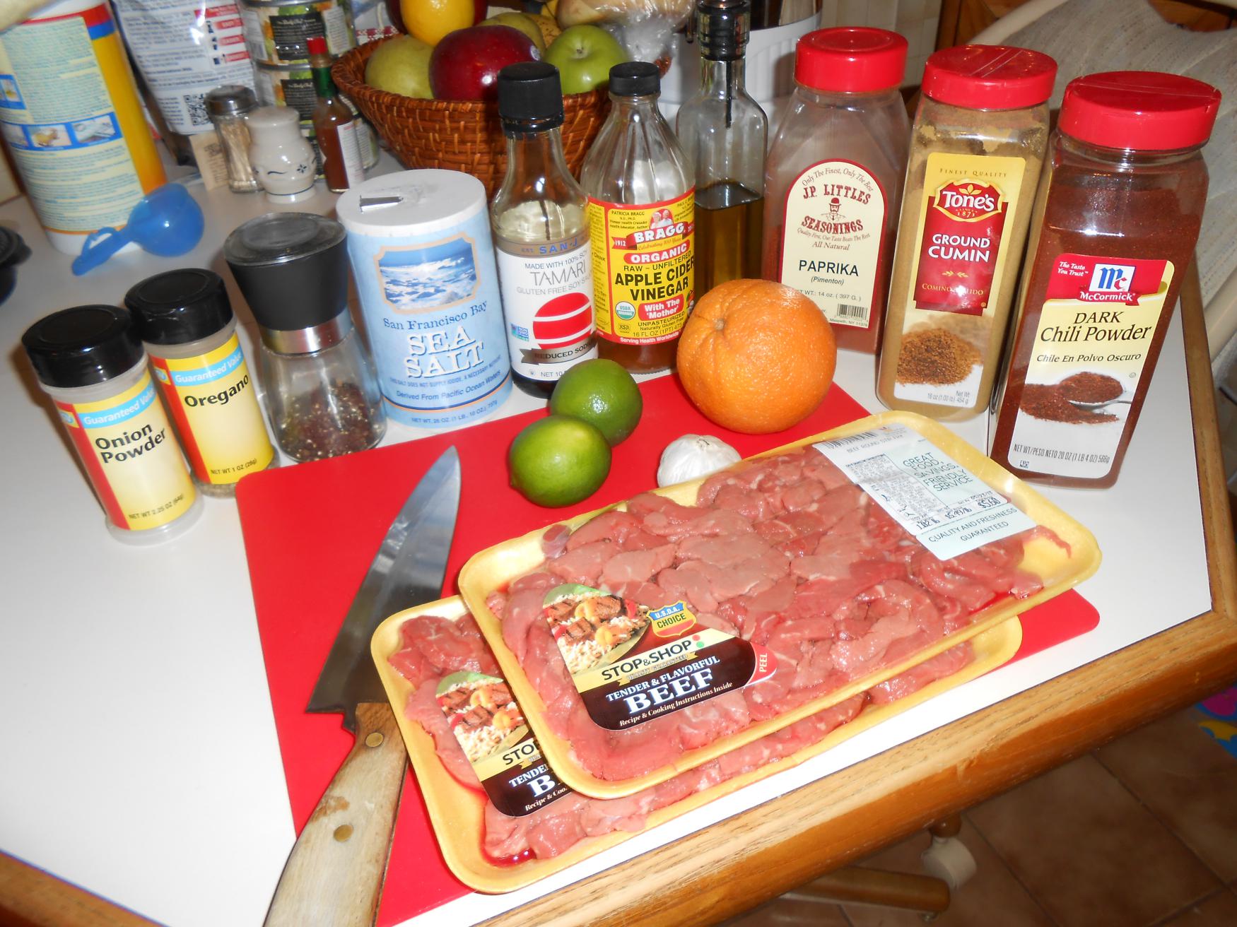 So to get started, gather all of your ingredients: Beef, garlic, orange, limes, chili powder, cumin, paprika, olive oil, apple cider vinegar, tamari, oregano, onion powder, and s&p . I used beef round stir fry. Is it a tough cut of meat? Sure. Is it cheap? Absolutely. Cheapest meat in my supermarket. Use whatever suits your taste.
