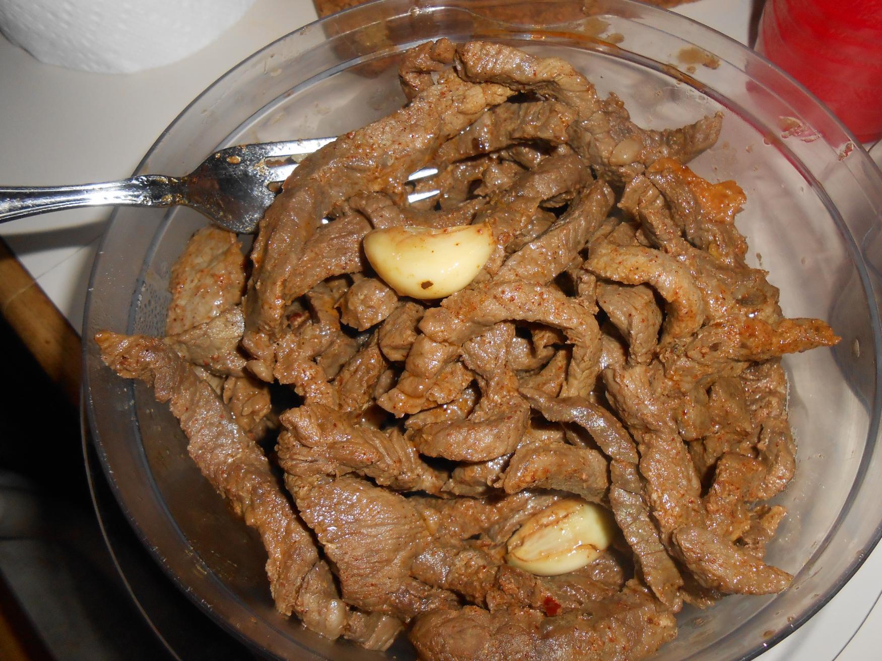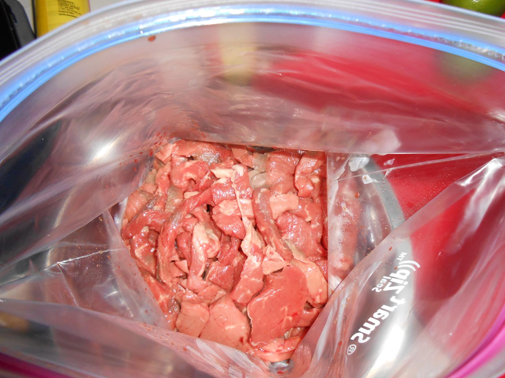 If your beef is not already sliced, slice it into thin strips and place in a zip-lock bag.