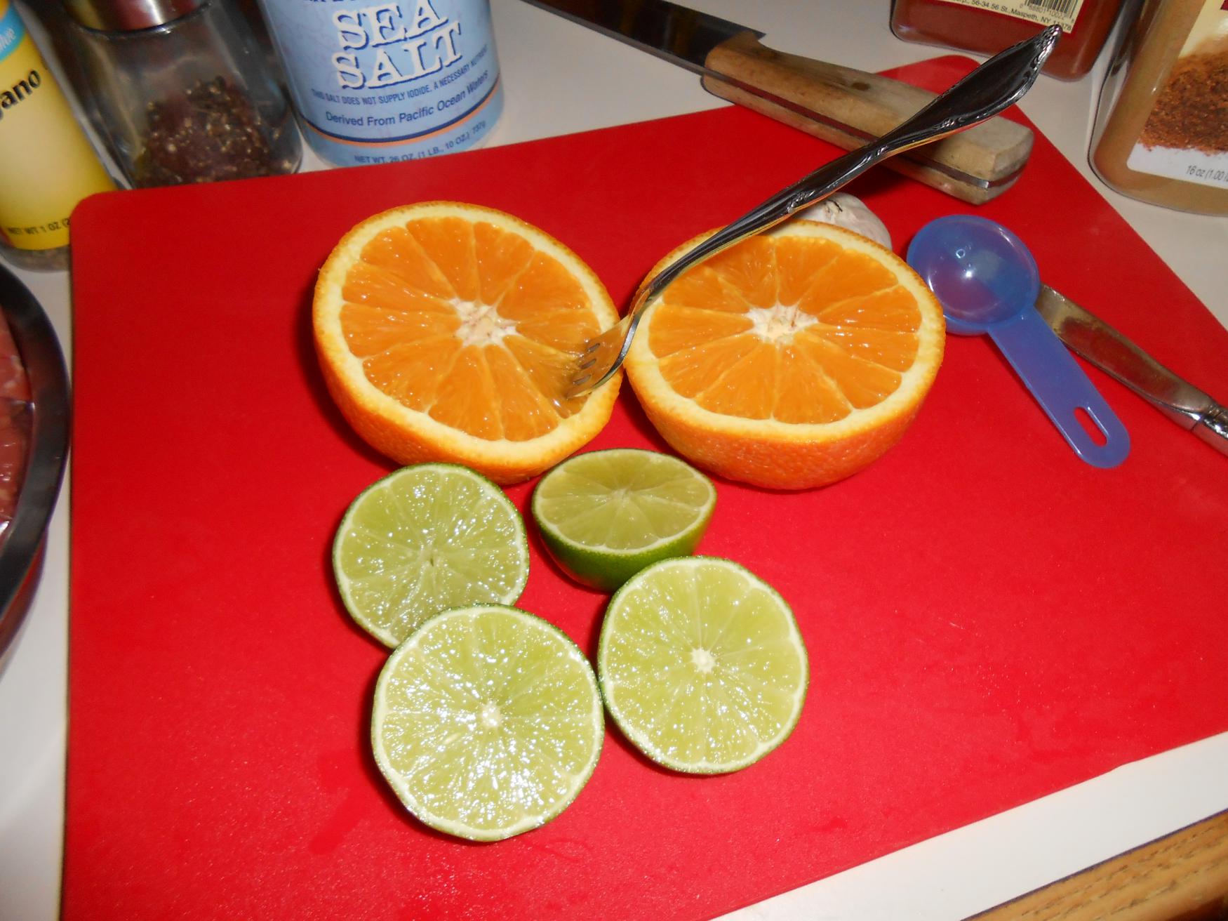 Juice your orange and limes over the zip-lock bag. You could use a fancy juicer if you have one, but I like to just use a fork and my hands. Stab around the citrus with the fork to tenderize the pulpy center and squeeze. The stabbing allows you to extract the most juice by hand.