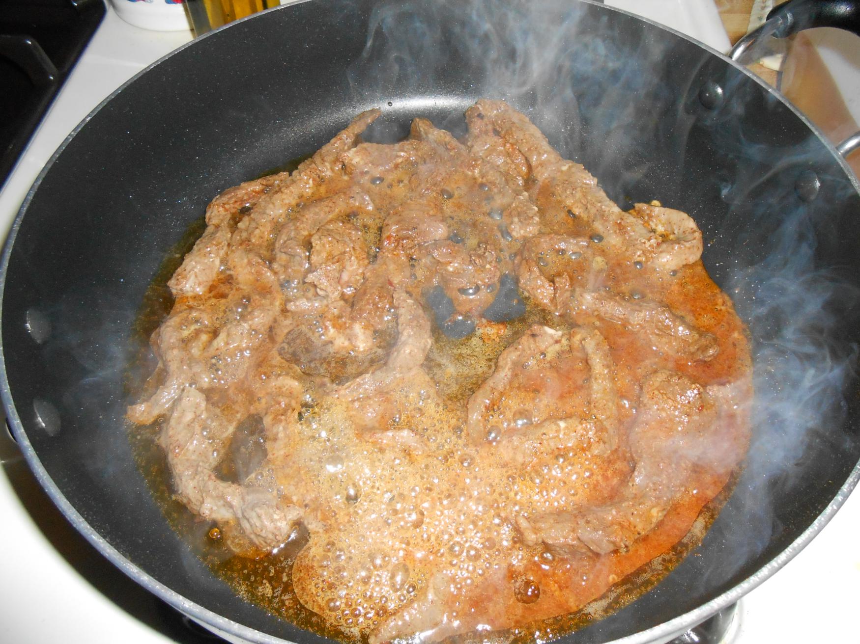 Add the beef to the hot pan and fry each side for about 2-3 minutes. Cook it in batches to make sure the meat gets a nice sear. If you dump everything in at once with the liquid, the meat will come out more steamed than seared. If that’s what you’re into, go for it!