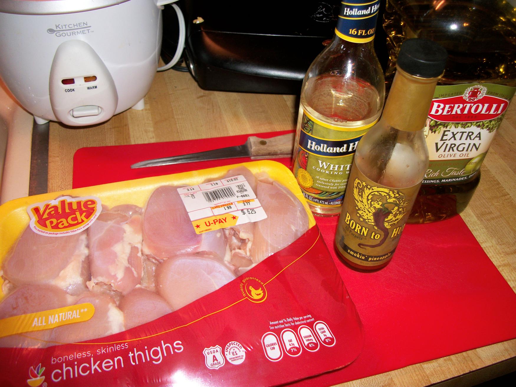 First, gather your ingredients: chicken thighs, olive oil, white cooking wine, Born to Hula Smokin’ Pineapple All Purpose Sauce, and chicken stock (not pictured). I discovered this sauce at the Belmar Seafood Festival and fell in love with its sweet, smoky, and spicy flavor! This company is amazing because the ingredients are all-natural and they do not use sugar or corn syrup in their sauces!