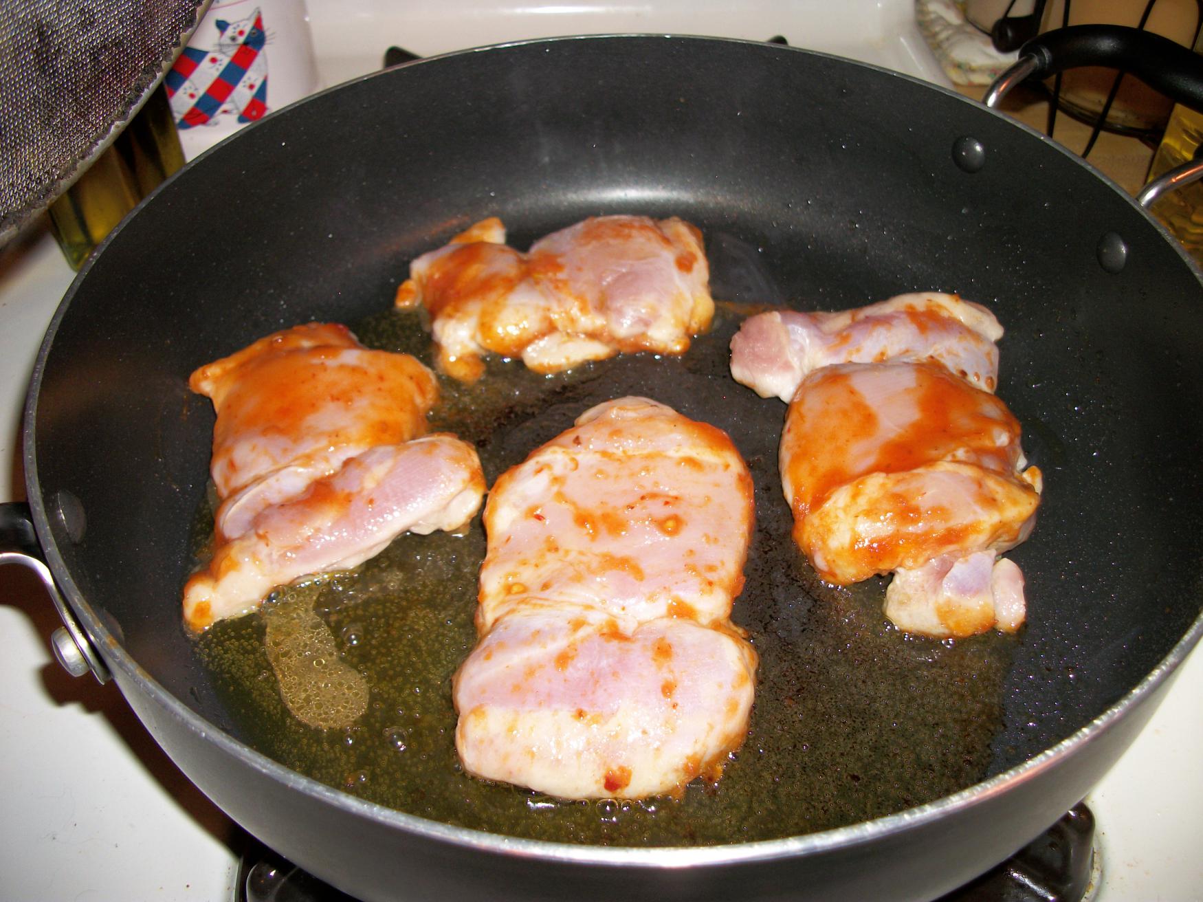 - Marinate your chicken thighs in 1/4-1/2 cup of the sauce for at least 1 hour. Add or reduce the amount depending on the size of your chicken.