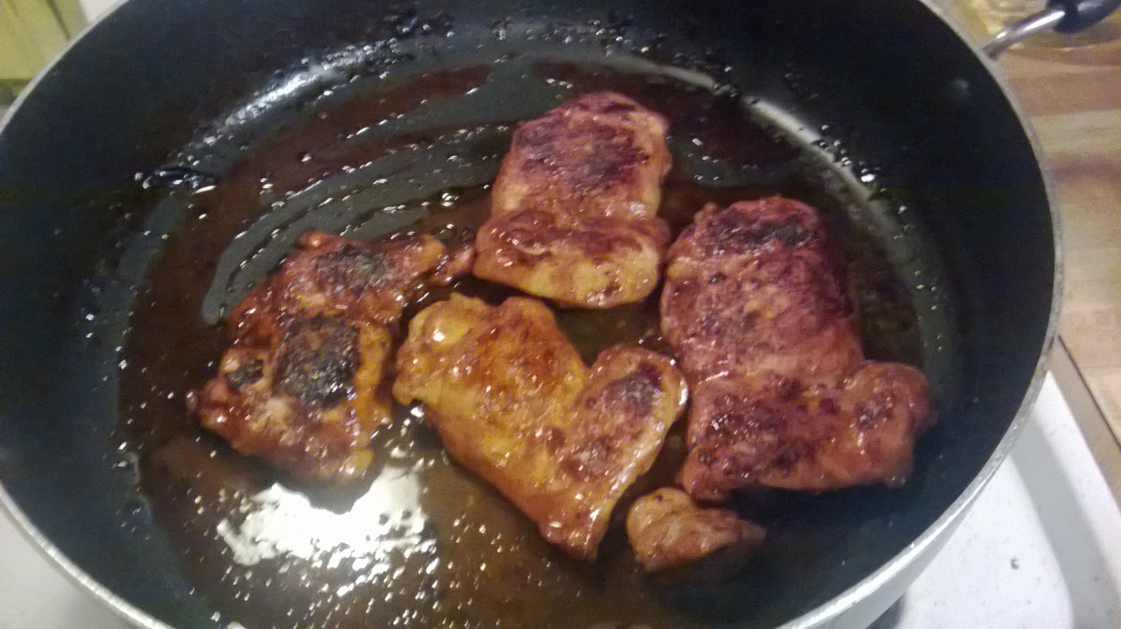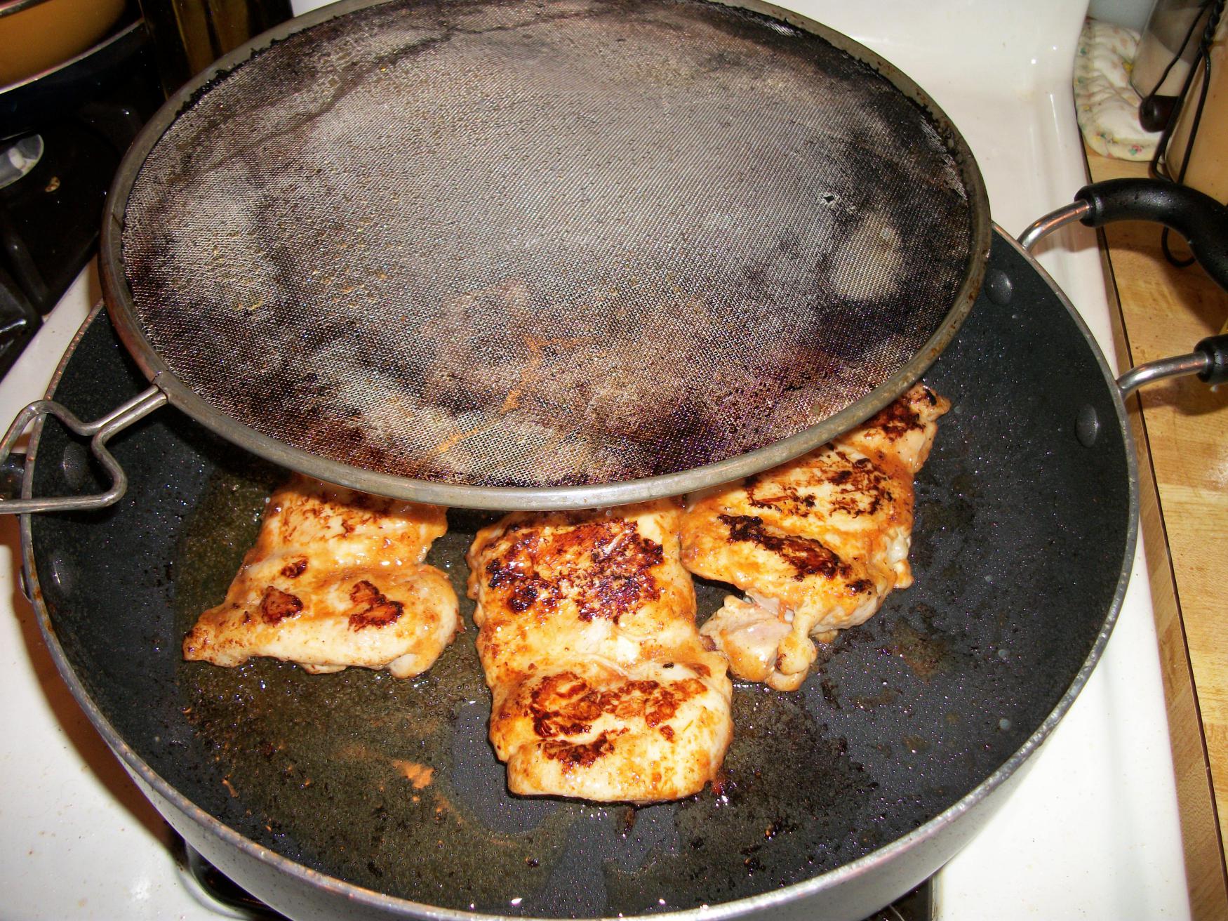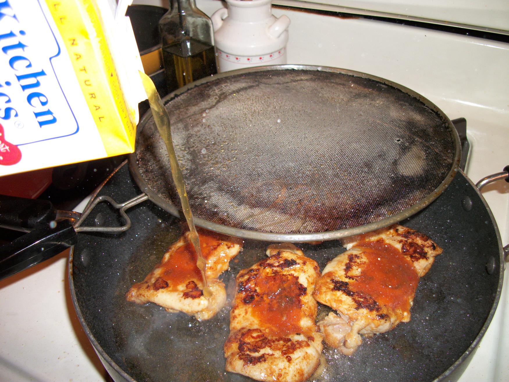 Once you have browned both sides, add a little bit of the sauce to coat the chicken again. Raise the heat to high and add about 1/3-1/2 cup of chicken stock to the pan and cover. Let the chicken stock simmer and evaporate. Keep an eye on your pan to make sure the stock doesn’t evaporate completely and burn your chicken.