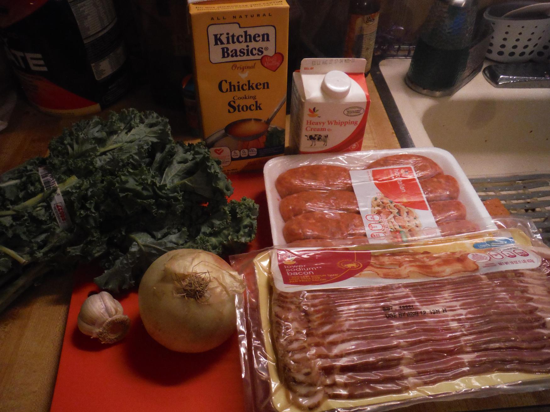 Gather your ingredients: hot Italian sausage, bacon, kale, garlic, chicken broth, heavy whipping cream, and S&P. You can tailor the soup to your taste with mild or sweet Italian sausage or swap swiss chard for the kale.