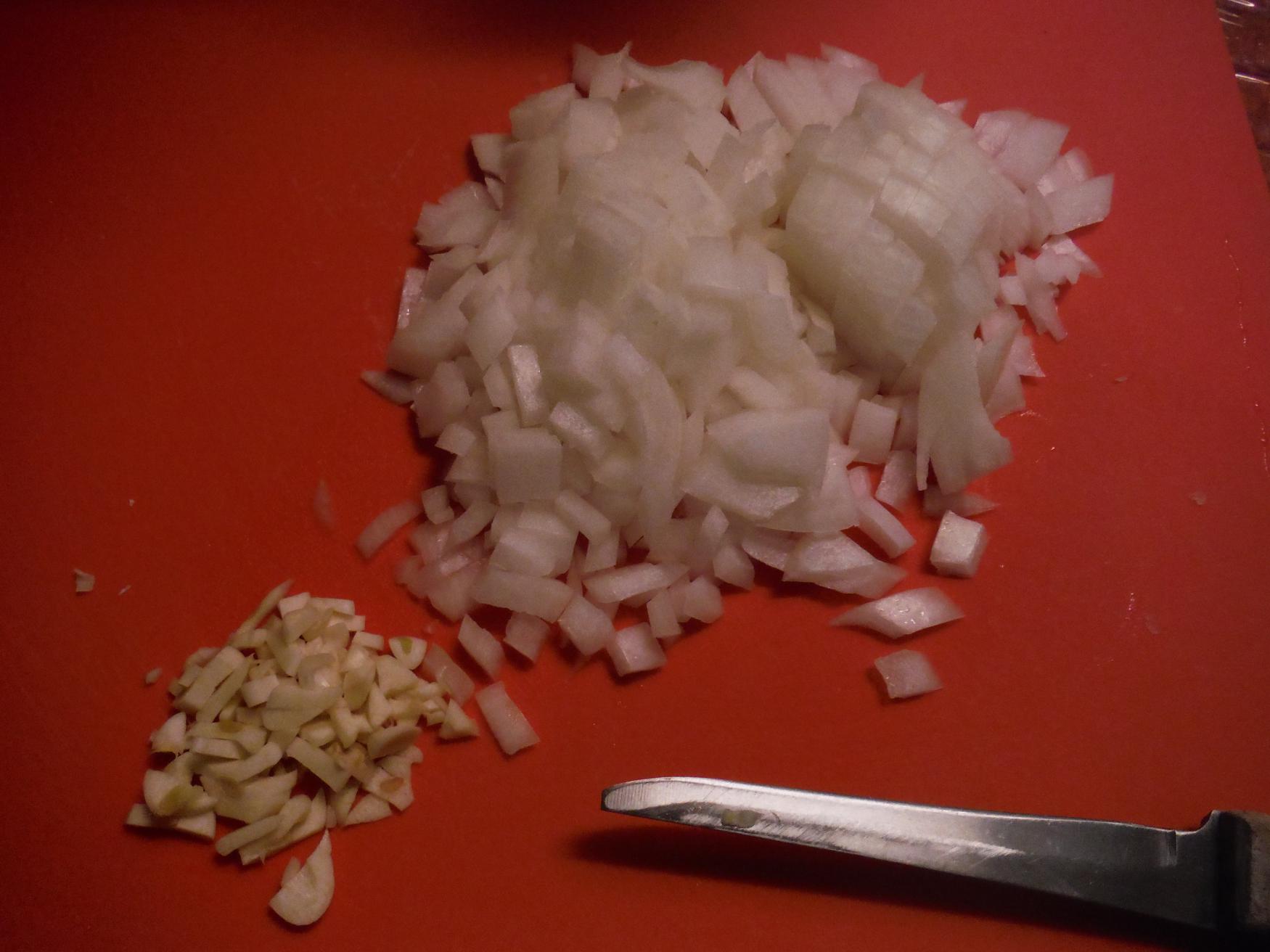 - Chop the onions and mince the garlic.