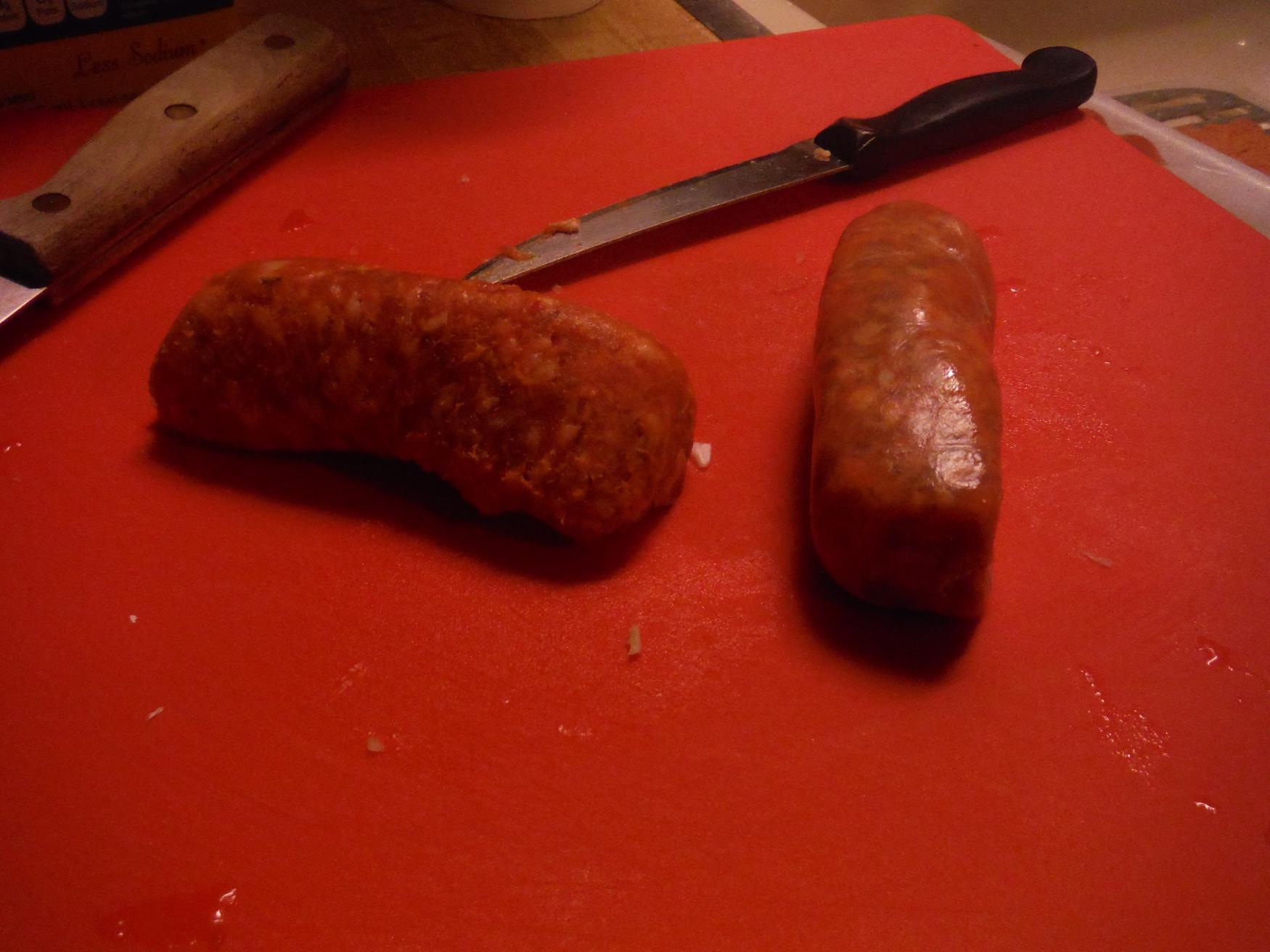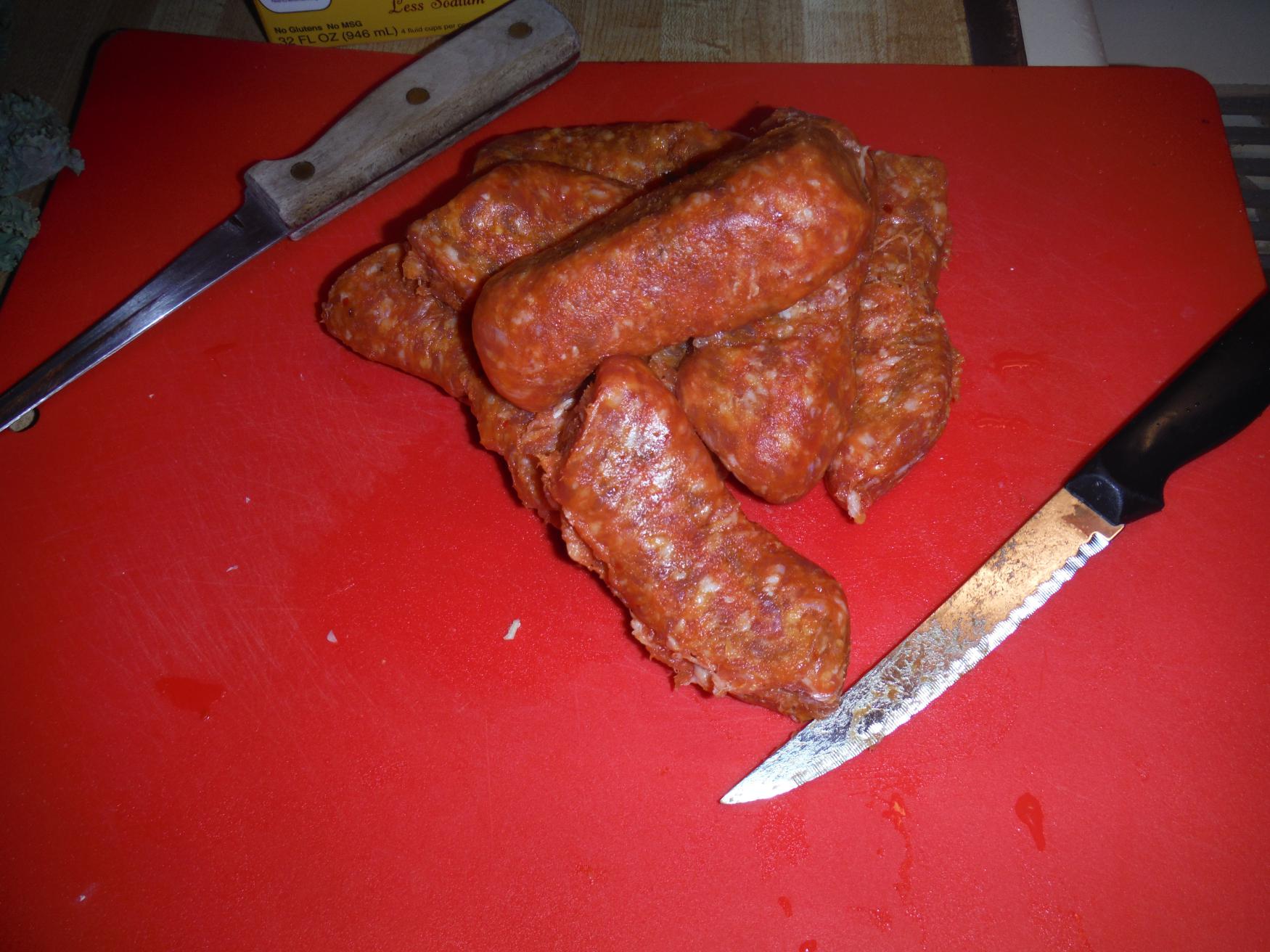 - Remove the casing from the sausage or slice into bite sized pieces.