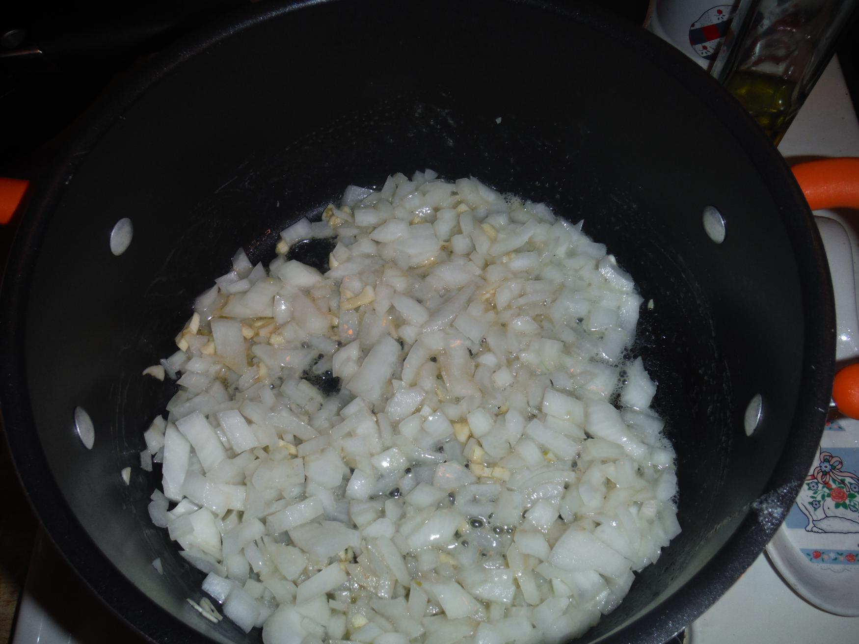 - Saute onions and garlic over medium heat until the onions are soft.