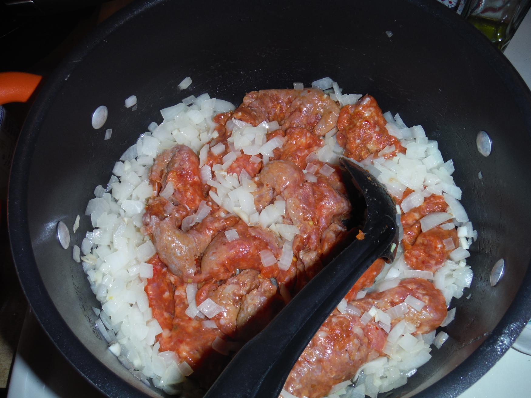 Add the naked sausage to the pot and chop with a cooking spoon. As the sausage browns, break up the large chunks until there is bite sized pieces.