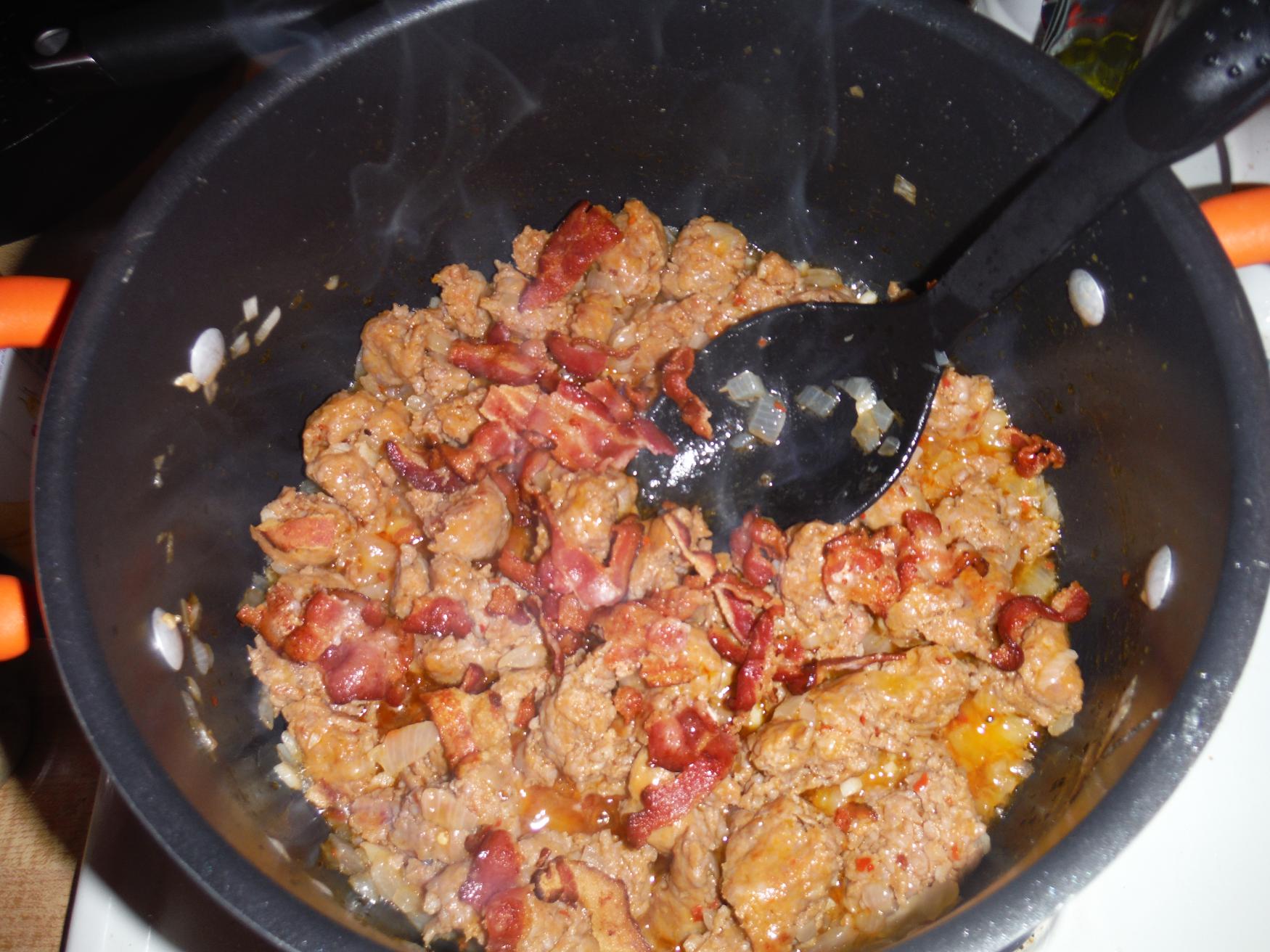 Once the sausage has browned completely, add in chopped cooked bacon. I was lazy and didn’t cut the bacon into small pieces, but if I did it over again I would make the pieces smaller. Large bacon slices looks a little icky when soft and wet (yes, that is indeed what she said).