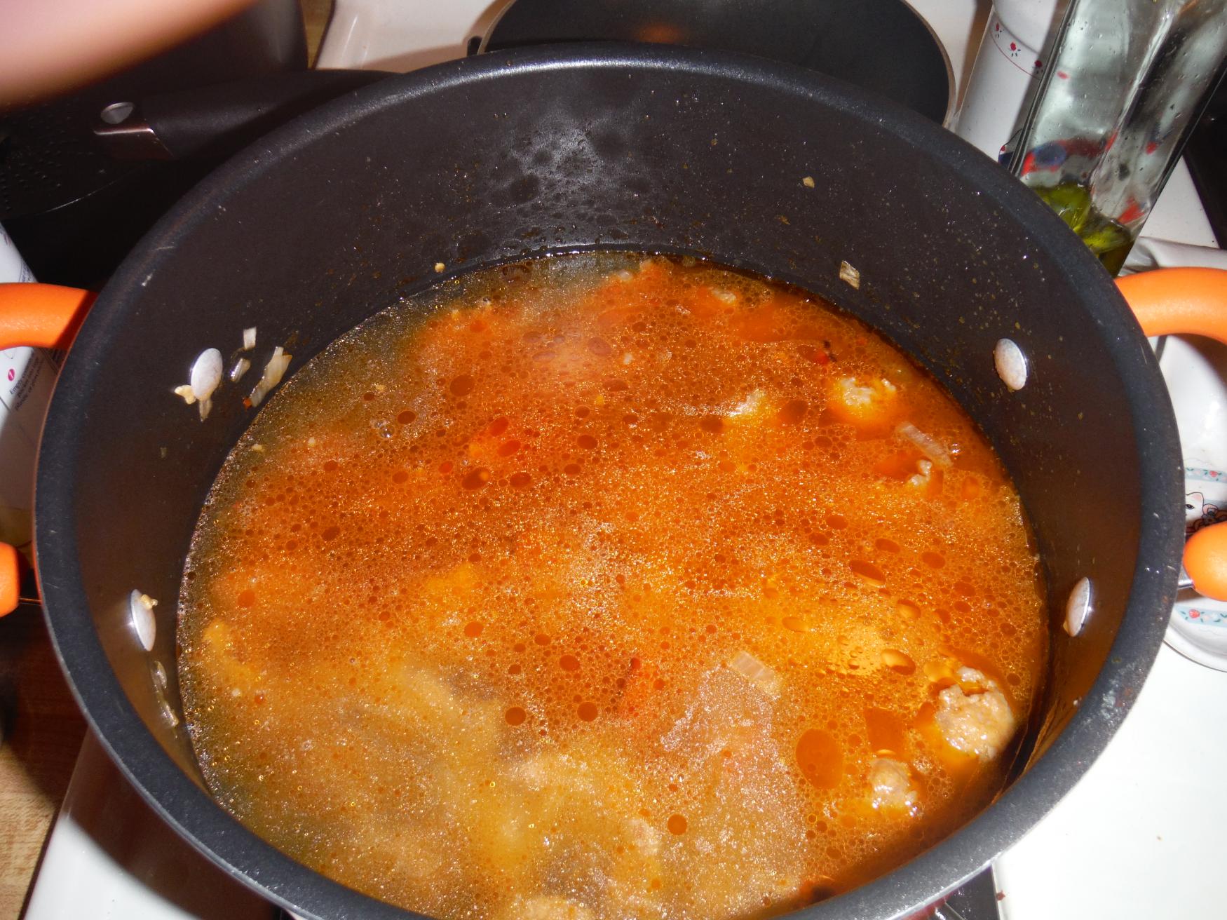 Add the chicken broth and water and bring to a boil.