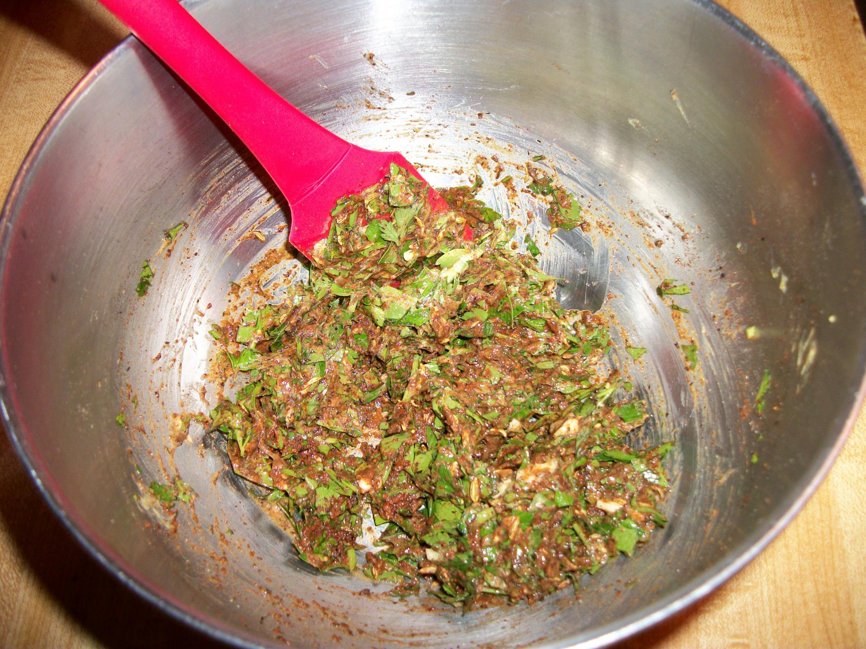 - In a large bowl combine garlic, salt, seeds, paprika, pepper, parsley, mustard, and egg. Mix until combined.