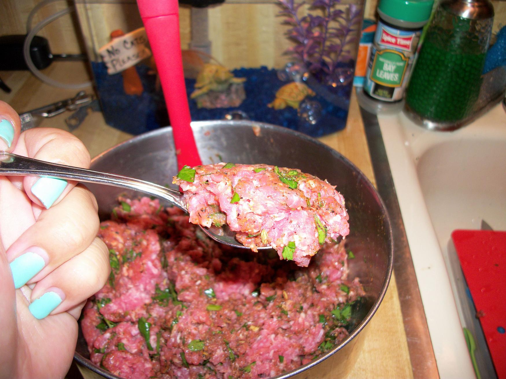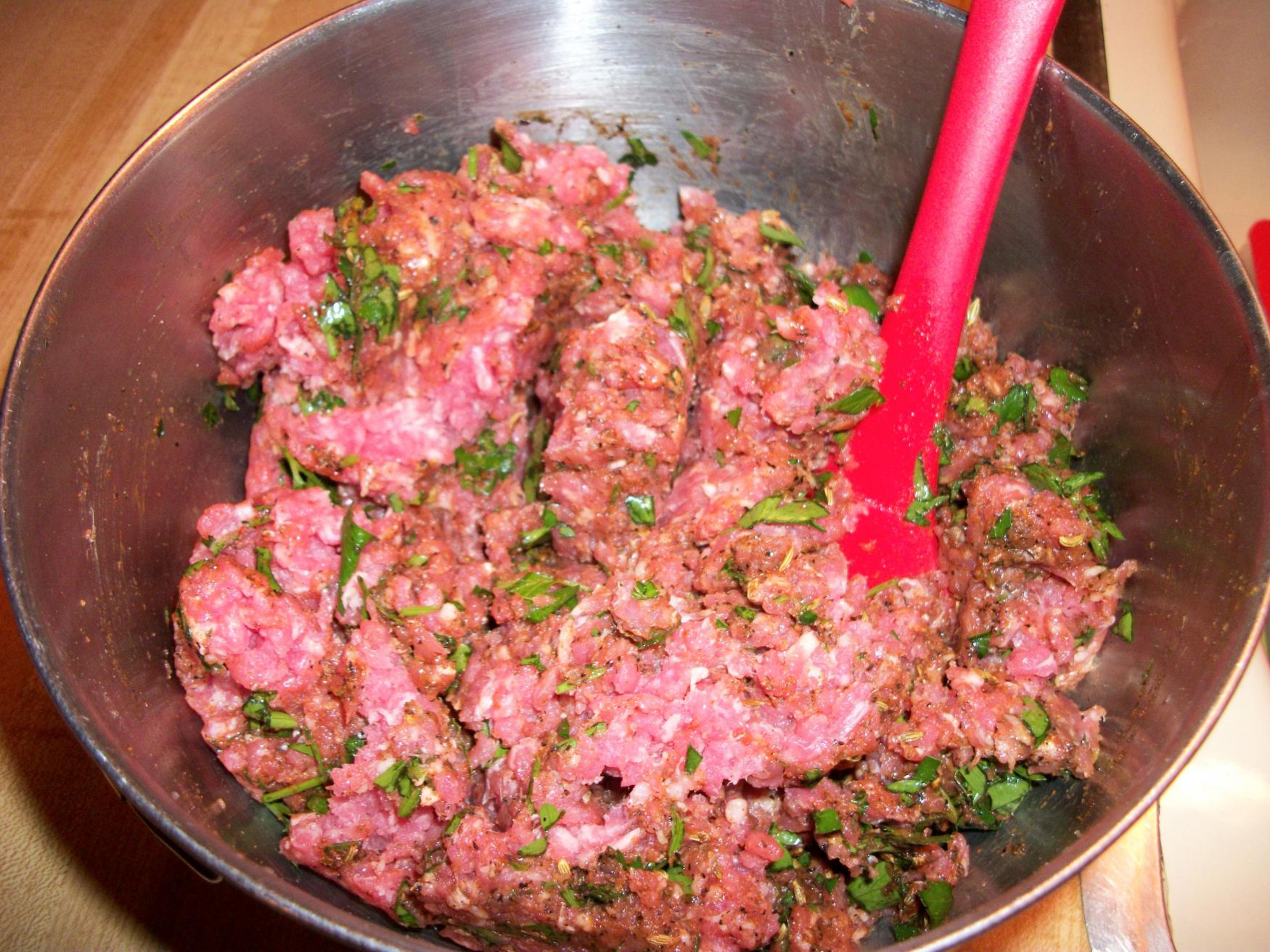 Gather your ingredients: ground pork, fresh parsley (make sure it’s fresh, dried won’t do the job), garlic, egg, mustard, caraway or fennel seeds, paprika, S&P.