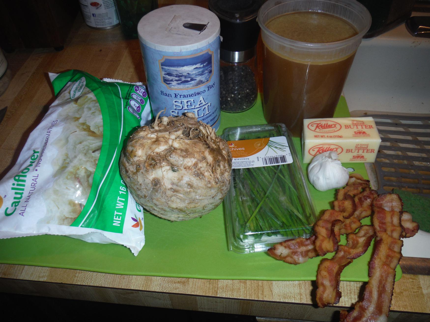 Gather your ingredients: frozen cauliflower, celery root, chicken stock, garlic, bacon, chives, butter or ghee, and salt and pepper.