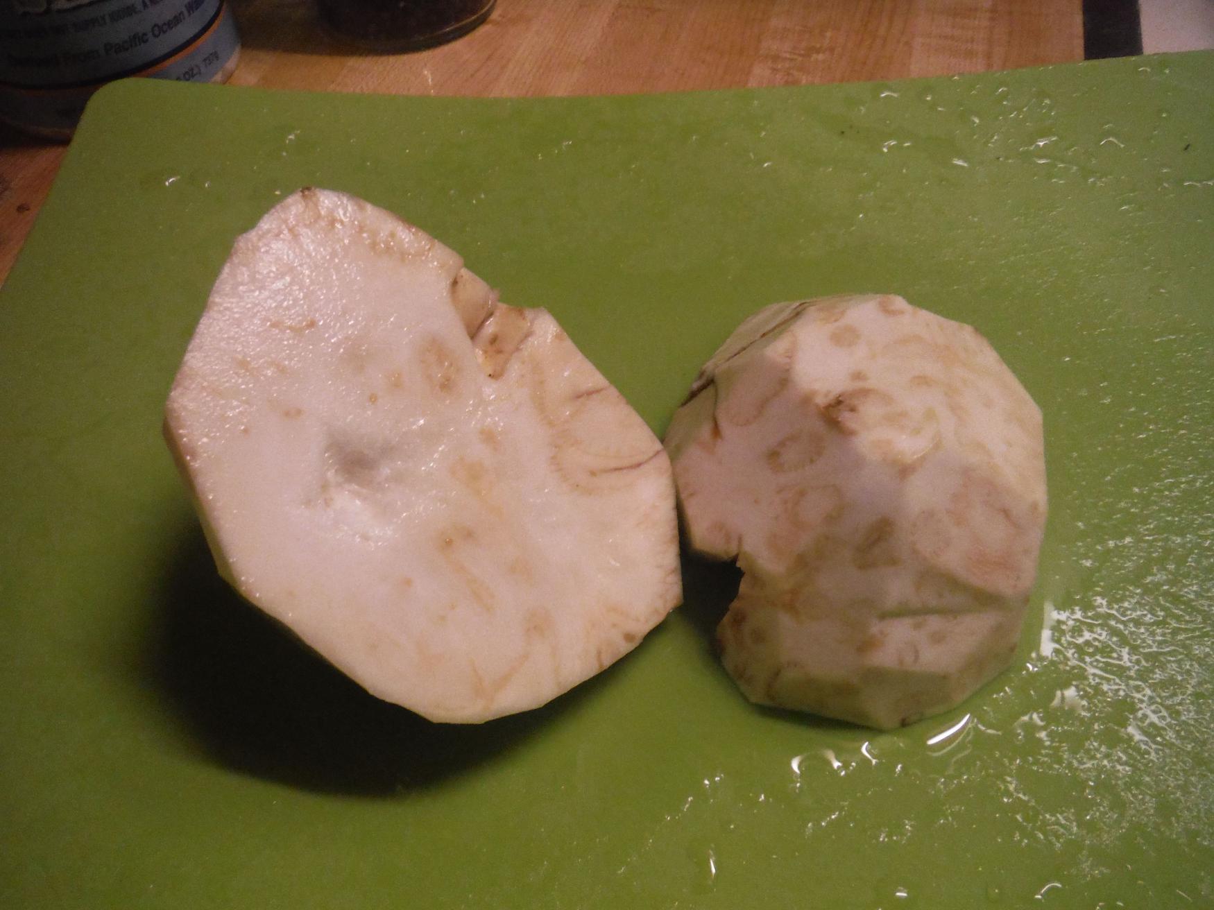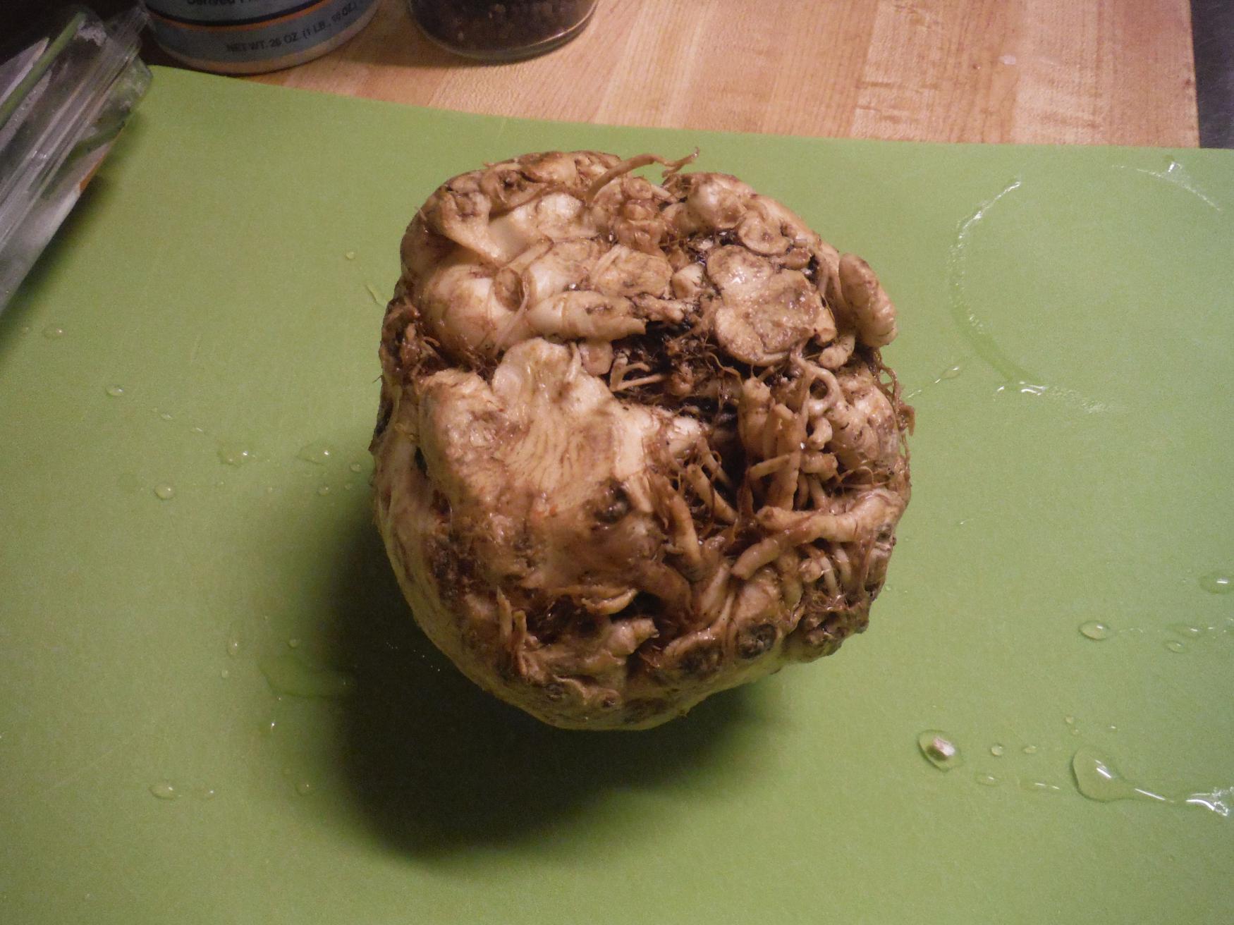 I’ve never cooked with or even purchased celery root before so it was a difficult find. It wasn’t available in my local supermarket, but I found it at my farmer’s market for less than $2.00. Ugly, isn’t it?