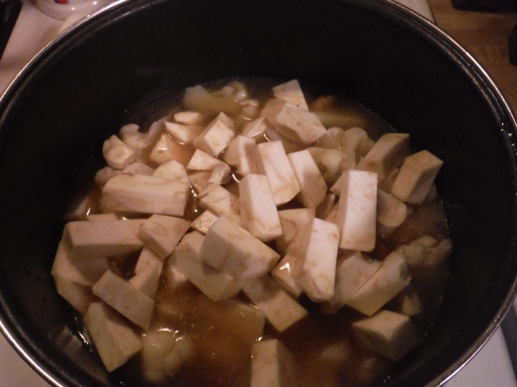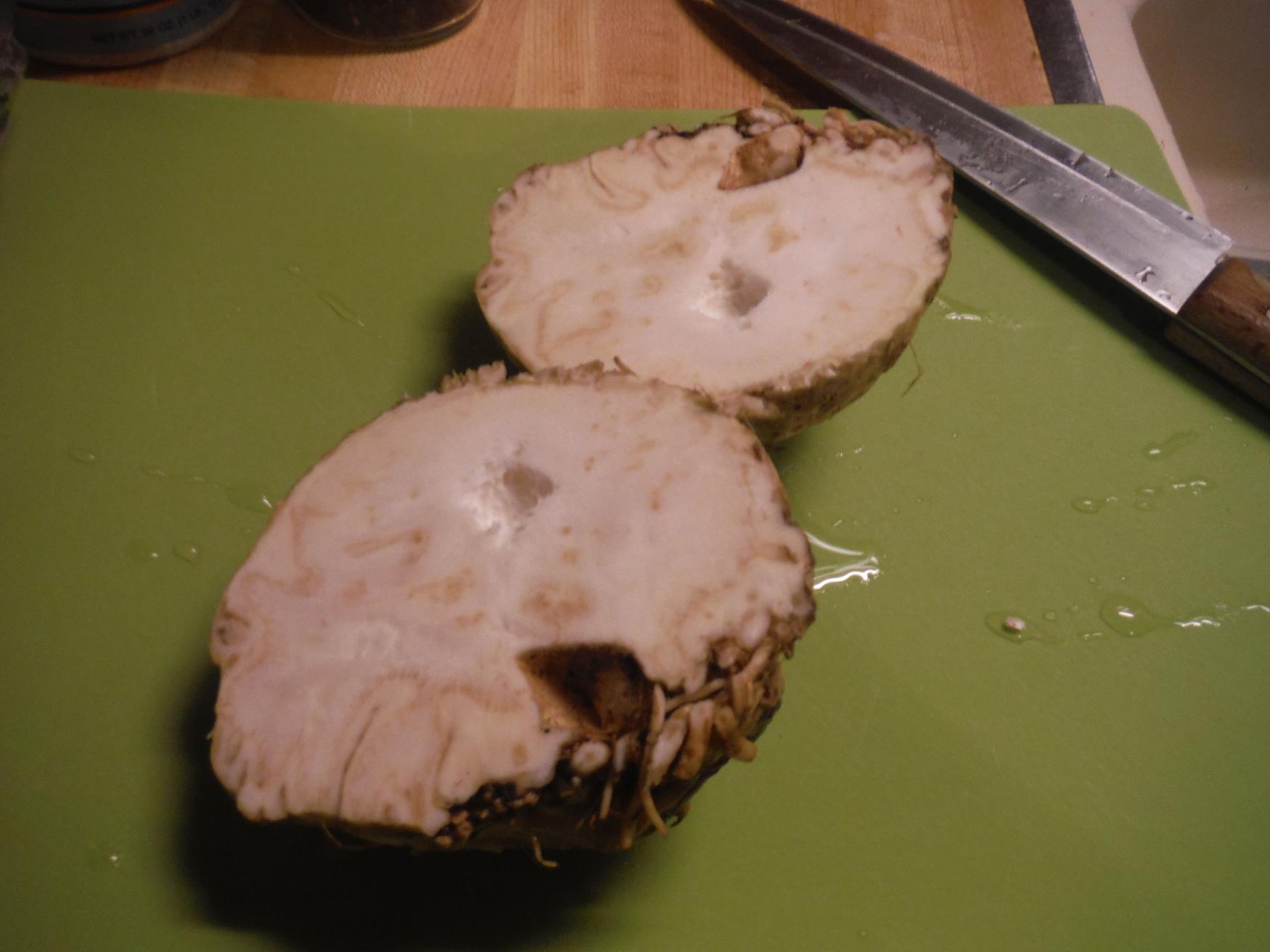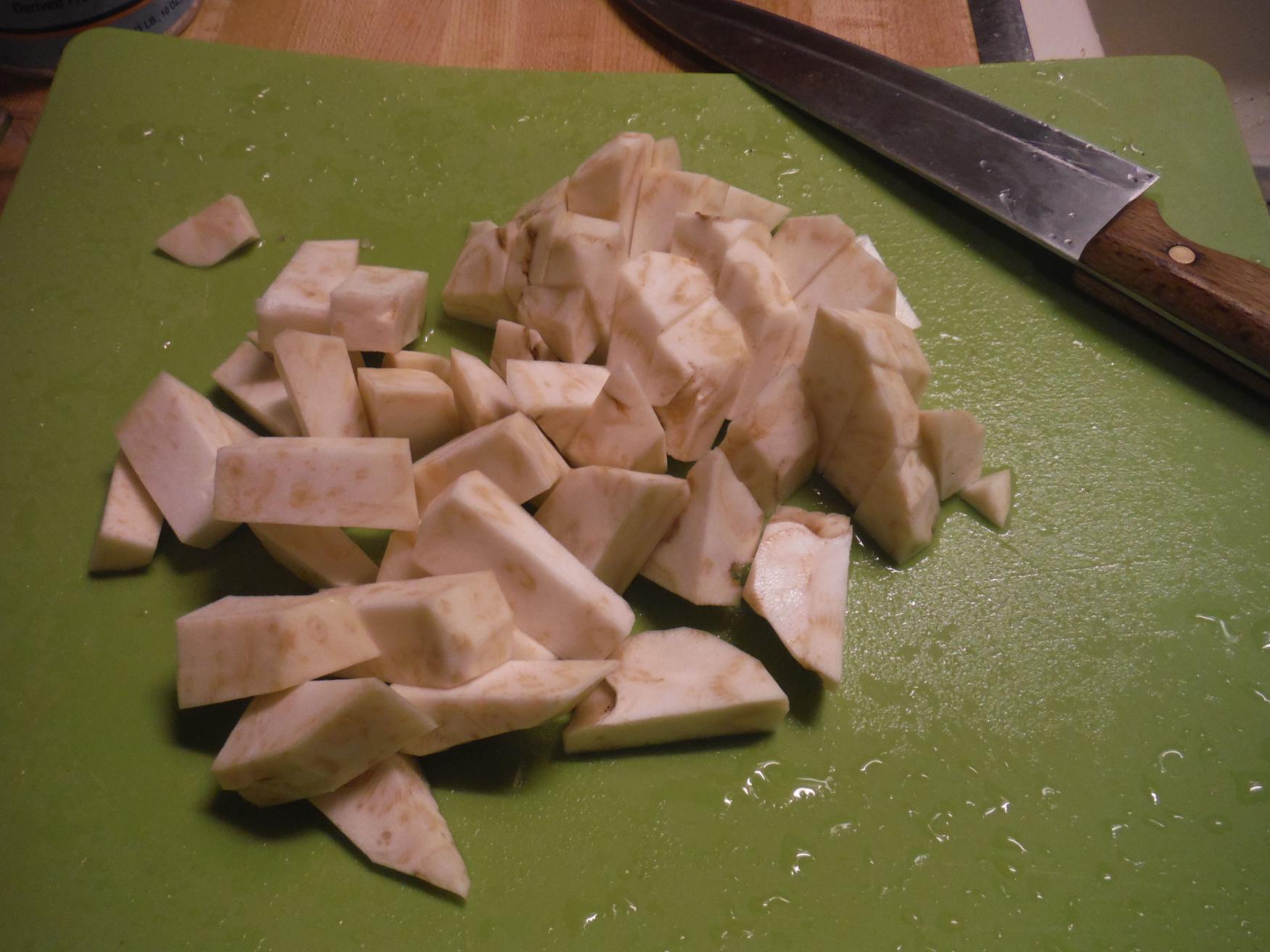 So I started by cutting it in half and peeling away the outer ugliness. Wash as you go because it is a root vegetable with dirt in every crevice.