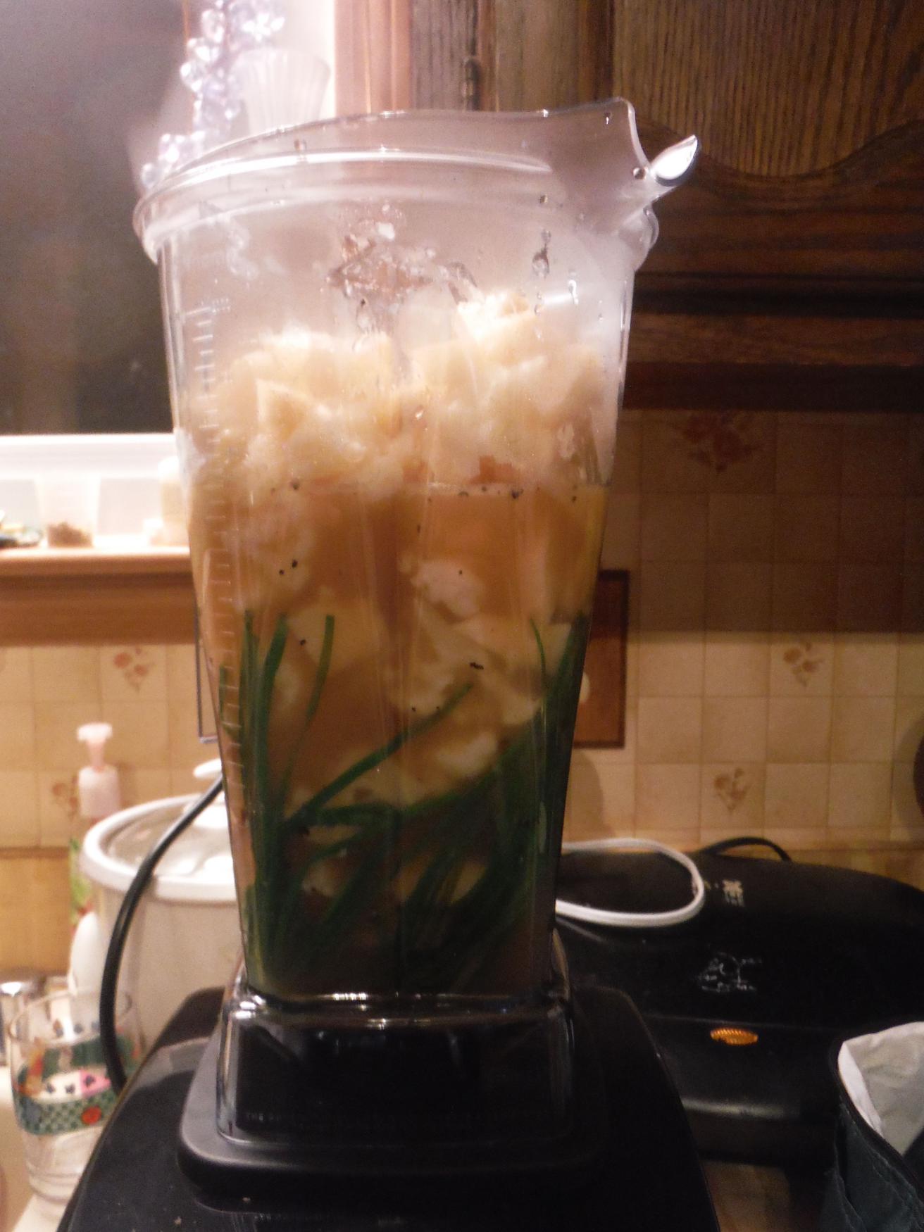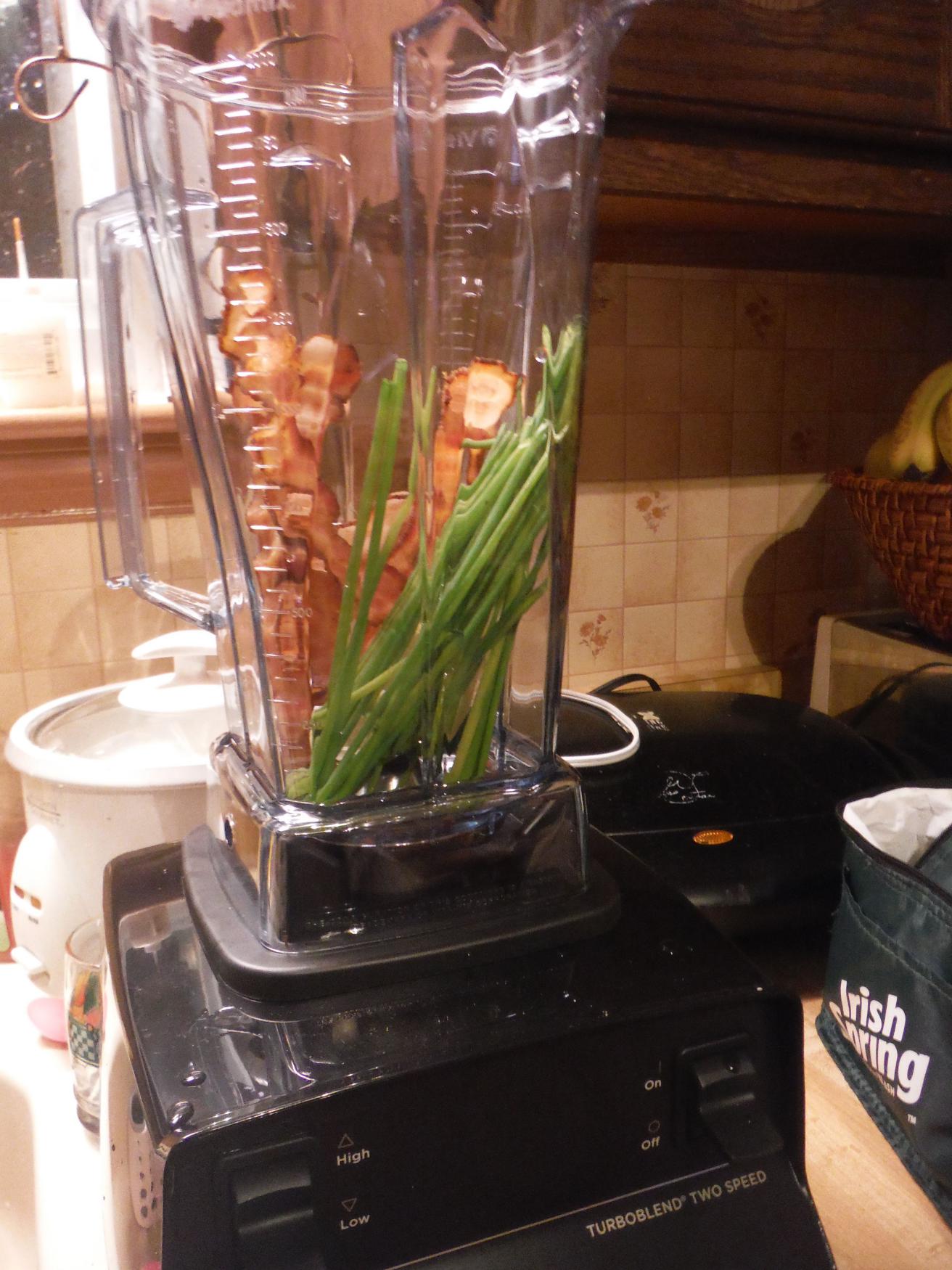 - Combine the soup, half the chives, 4 slices of bacon, and butter or ghee in a Vitamix. You can use an immersion blender or regular old blender to get the job done too.