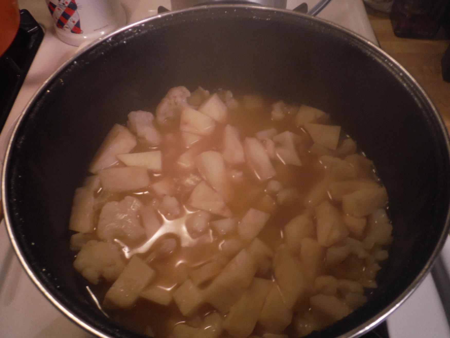 - Combine the cauliflower, celery root, and chicken broth in a large pot over medium-high heat.