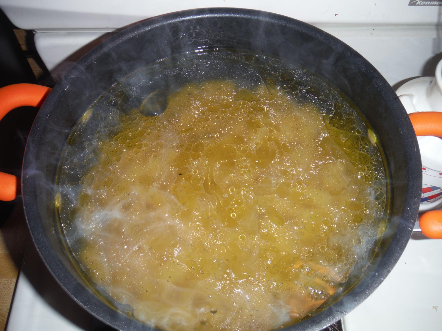 - In a large pot, add water, olive oil, and salt. Bring to a boil over high heat. Once boiling, add pasta and cook according to box instructions.