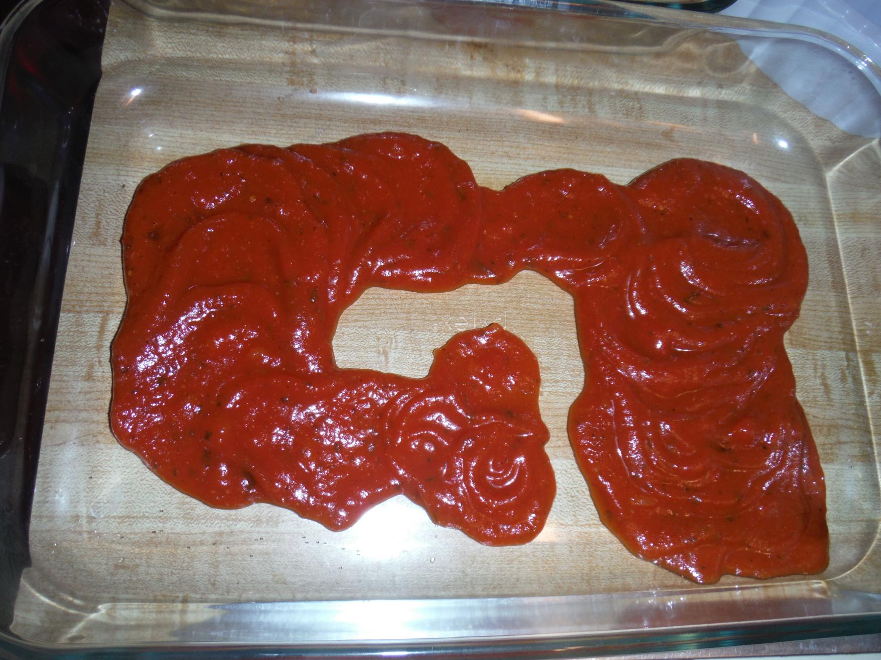 In a large baking dish, pour in some sauce. (If you’d like to make your own sauce, try this one. It’s delicious!)