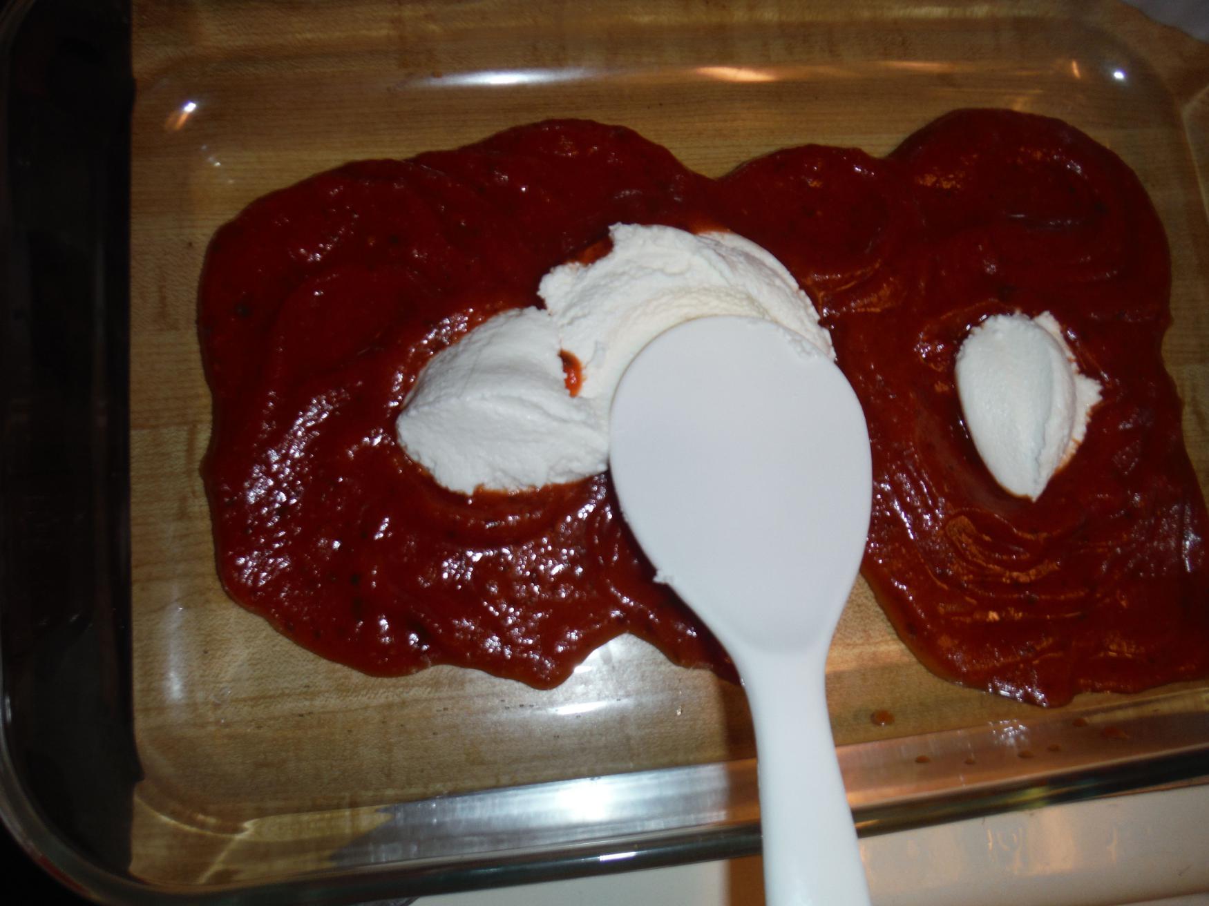 Spoon in some ricotta cheese and combine with the sauce. Yes, that is a rice scoop. It works incredibly well as a ricotta-spreader. 🙂