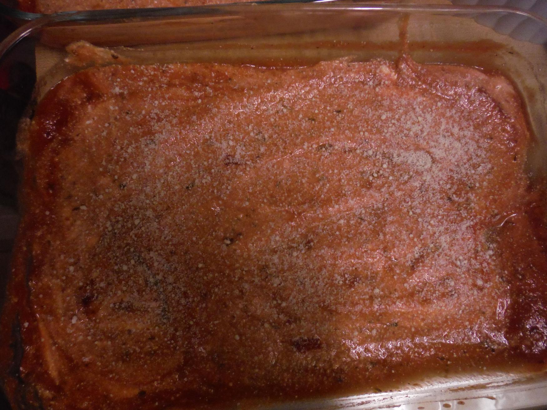 Combine the sauce and ricotta. Spread the mixture to coat the bottom of the pan. Sprinkle on the parmesan and/or asiago cheese.