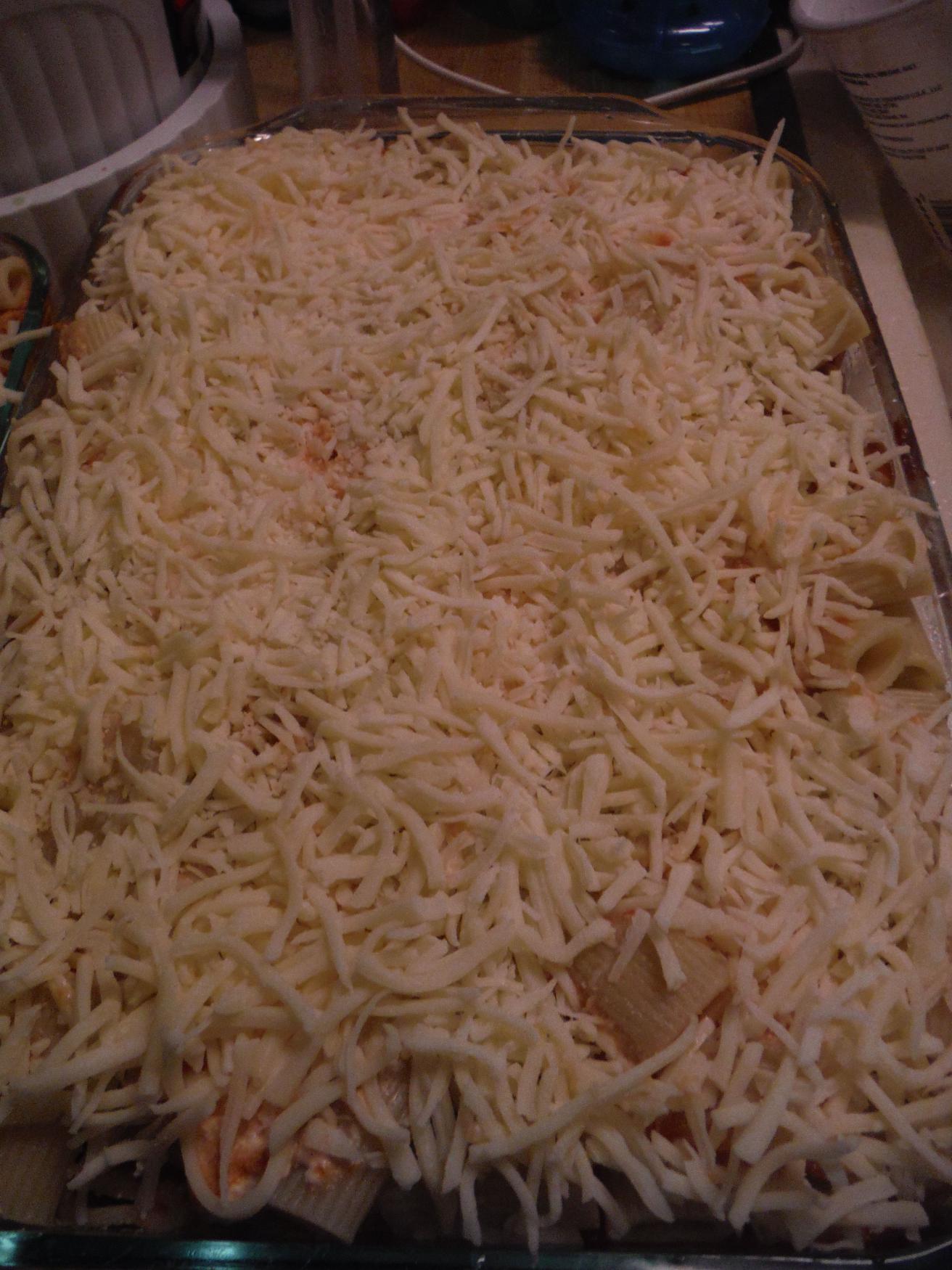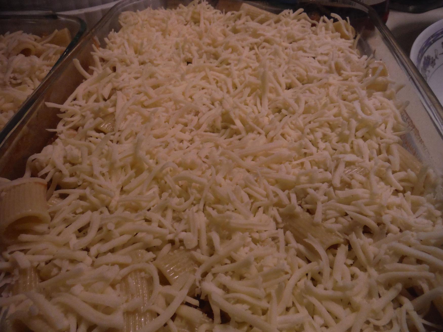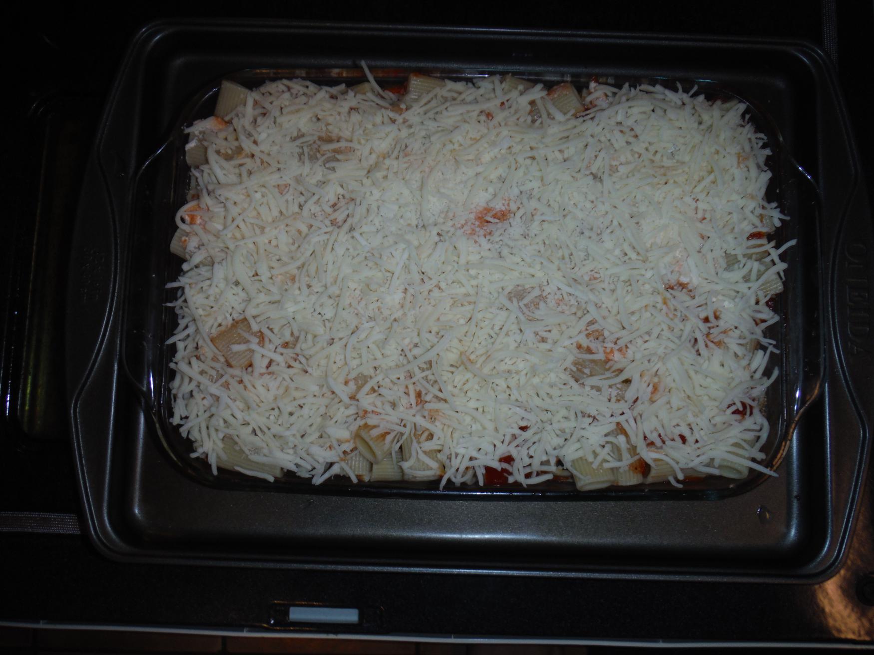 - Add half of the pasta and cover with mozzarella cheese.
