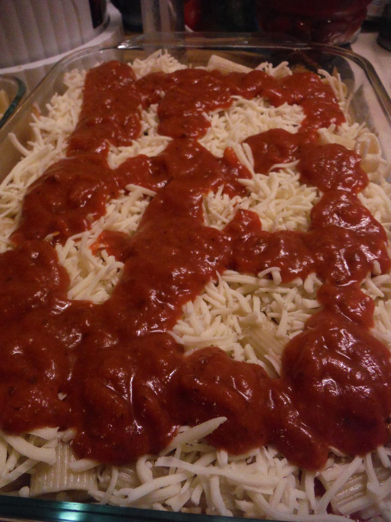 I think you see where this is going! Making the ziti like a lasagna makes it flavorful and cheesy throughout! Add another layer of sauce.
