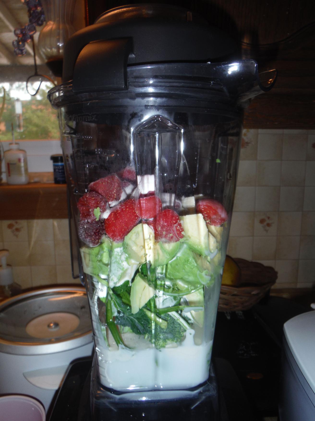 Start with avocado, banana, broccoli, spinach, frozen strawberries, and coconut milk.