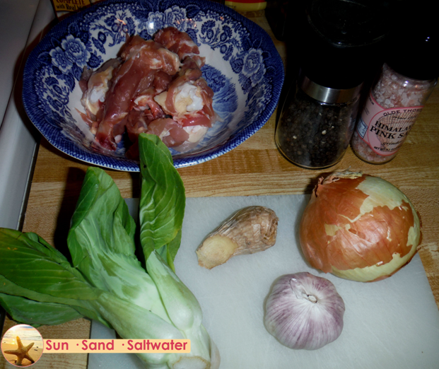 Gather your ingredients: bones from 4-6 chicken thighs or 2-3 bone-in chicken thighs, bok choy, ginger, onion, garlic, S&P, olive oil, and water. You can add either diced chayote or potato (Chayote is a green squash with the texture and consistency of a potato). The base of this soup comes from all the goodness in the chicken bones – so if you have some extra bones lying around, which I do quite often, use those. When I make my Paleo fried chicken, I de-bone them and keep the bones in the freezer for a rainy day. If not, you can use bone-in chicken thighs. I don’t recommend making this with boneless chicken because you’re going to be missing that extra flavor in the soup. If you want to add in some extra protein and have some shredded chicken handy, use that as garnish.
