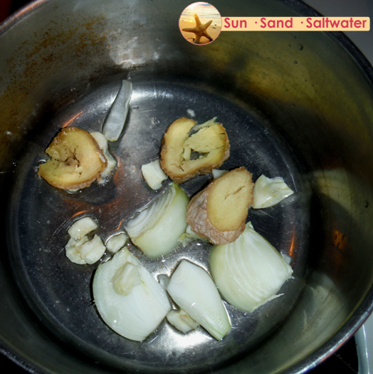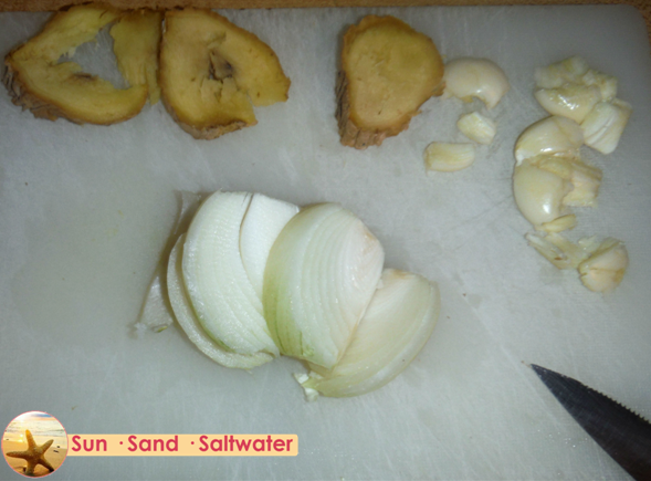 Crush 3 slices of ginger and garlic to extract flavor. Roughly chop the onion.