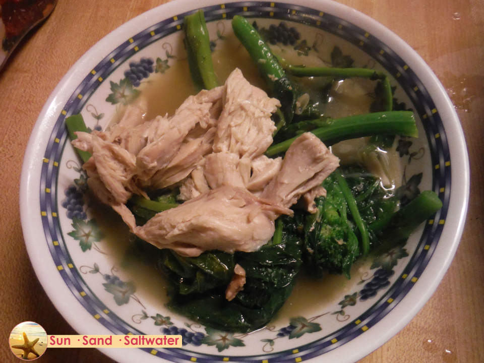 Completely cover the meat with water and bring to a boil. Once boiling, reduce the heat and simmer for 40-45 minutes. Add bok choy or Chinese broccoli and cook until wilted.