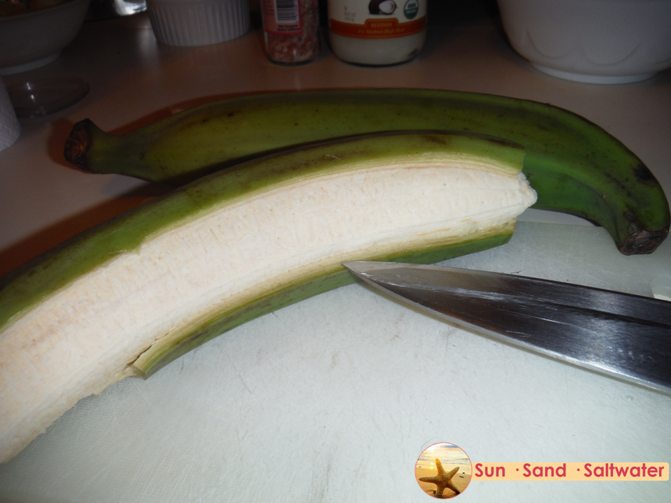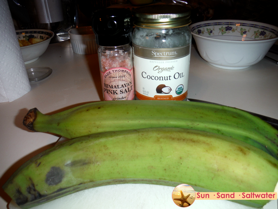Gather your ingredients: green plantains, coconut oil, and sea salt. Yep, that’s it.