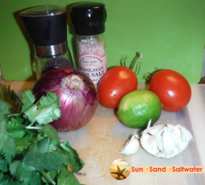 Gather your ingredients: tomatoes, red onion, garlic, cilantro, limes, and salt & pepper.